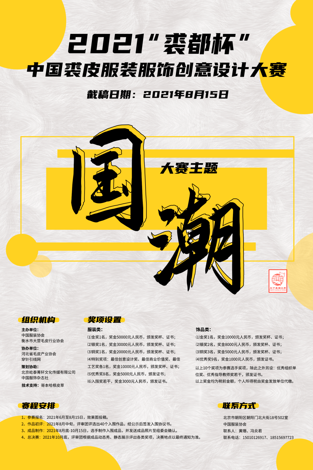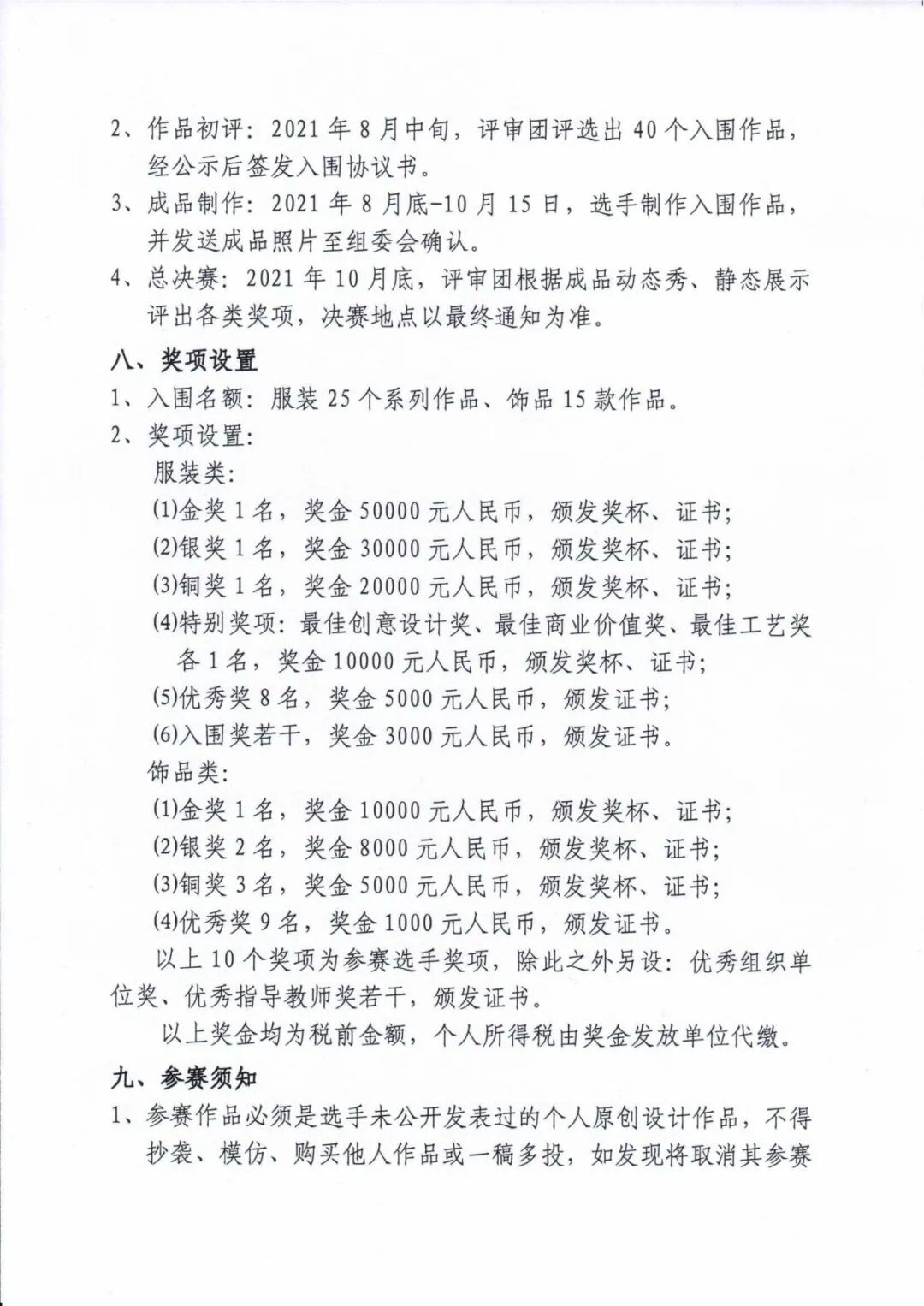 ⑹入围后制作成品所需材料、加工均由选手自行准备,组委会对“服装”入围作品给予补助。不得出现仿真皮草,发现后将取消其参赛资格并且补助全额退回。