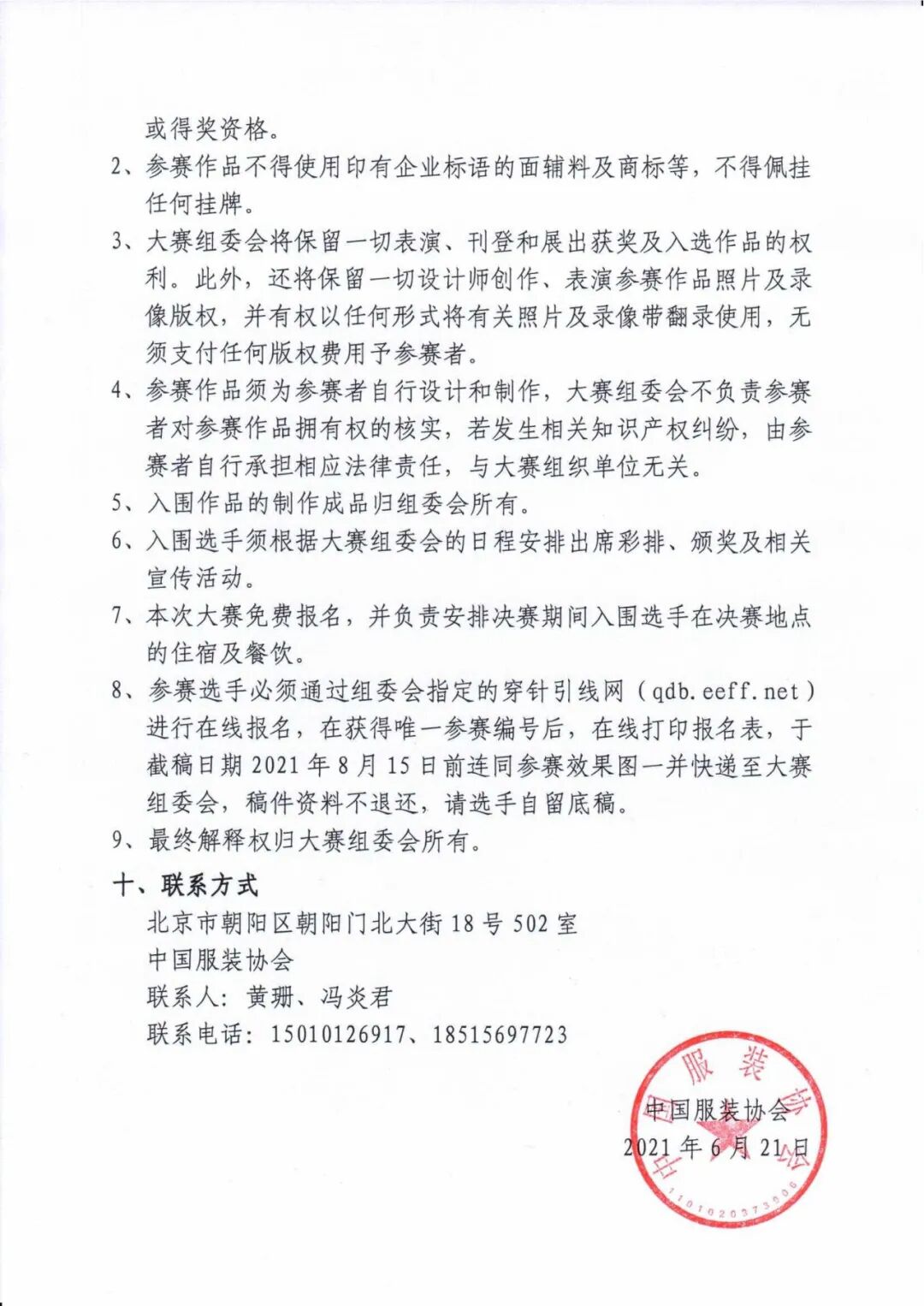 8、参赛选手必须通过组委会指定的穿针引线网(qdb.eeff.net)进行在线报名,在获得唯一参赛编号后,在线打印报名表,于截稿日期2021年8月15日前连同参赛效果图一并快递至大赛组委会,稿件资料不退还,请选手自留底稿。