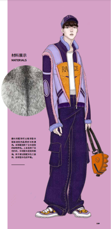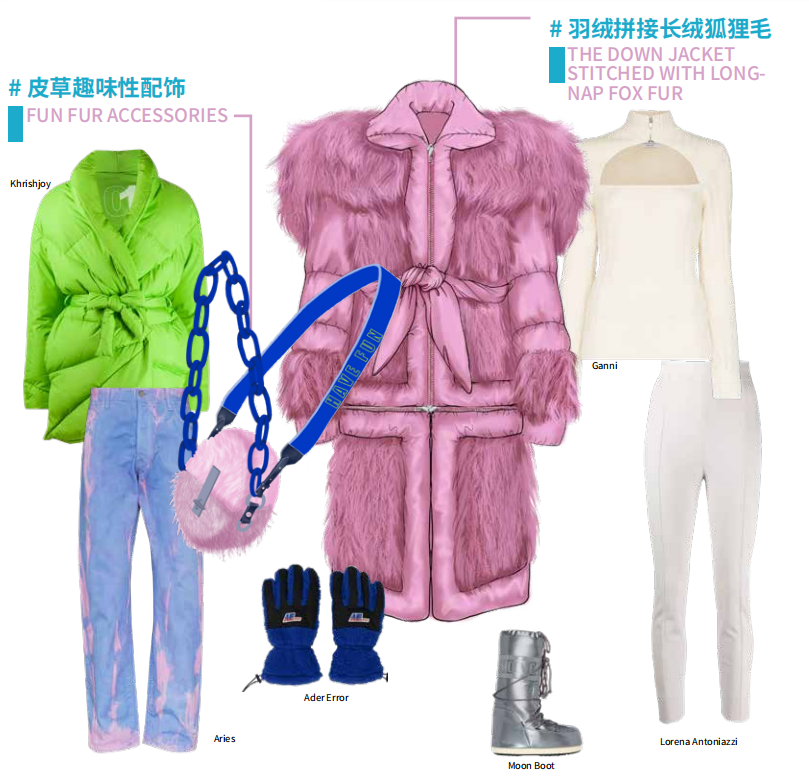 皮草趣味性配饰。该饰品运用了两种不同形制的肩带,可在不同场合进行穿搭切换。毛绒感趣味手提包采用了鲜明的色彩,具有街头感,体现了使用物与装饰物的无界组合。