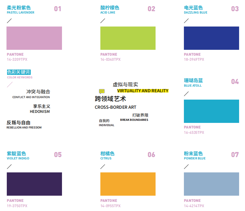本季色彩从享乐主义的虚拟世界中汲取。乐观与激进派别思潮的交杂演变成本主题中碰撞又能融合的对比色系。珊瑚岛蓝色与柔光粉紫色是最为跳跃的搭配色彩,传达出虚拟世界中追求享乐的纯粹理想。酸柠檬色与柑橘色作为搭配色彩反映出在虚拟世界中渴求建立方向的理想思维。电光蓝色与紫靛蓝色作为主题中最深层的色彩,暗喻现实的真相。中性的粉末蓝将虚拟与现实调和并平衡地搭配起来。