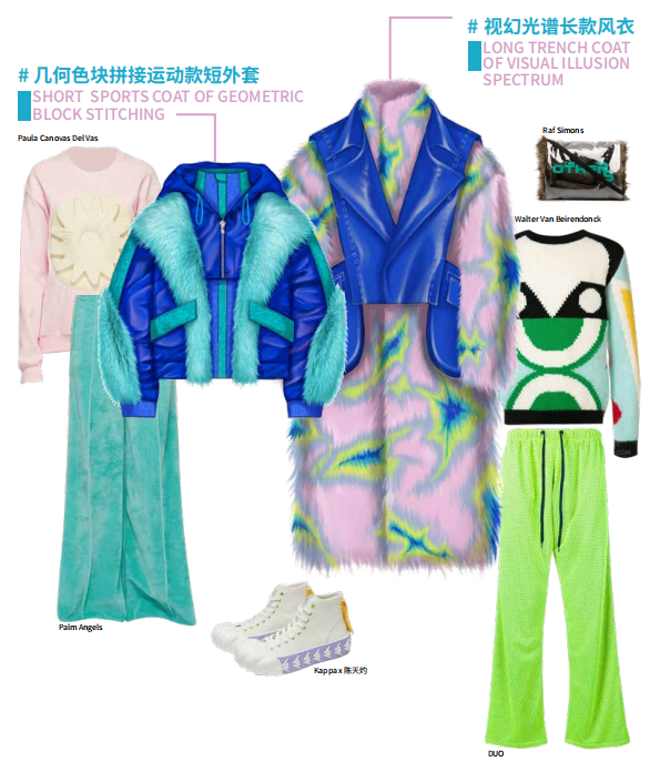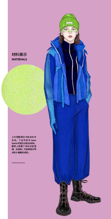 几何色块拼接运动款短外套。在色彩上选用了电光蓝与珊瑚岛蓝,色彩搭配轻快鲜明,富有元气与活力。此外,运用了几何色块组合的图形,在不同材质之间进行拼接,使该款式的整体效果轻松有趣。