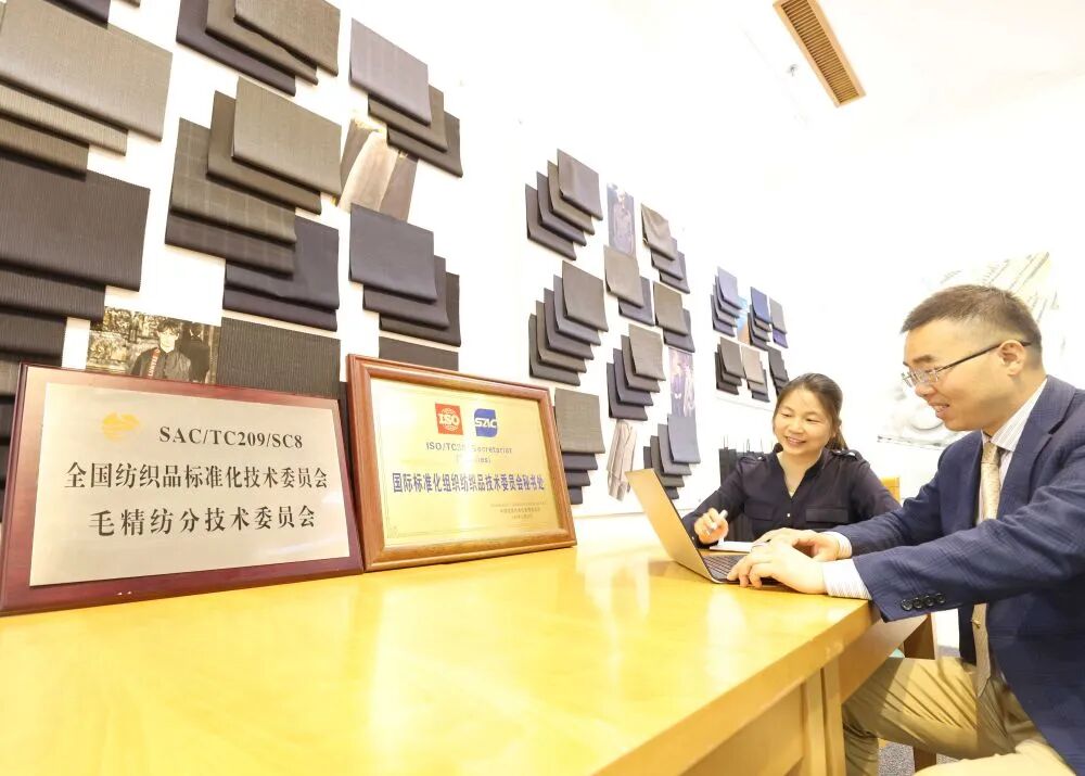 江苏阳光集团技术中心科技主任、国际标准化组织纺织品技术委员会国际秘书处经理许勇(右)和秘书处同事在办公室通过网络与国外同行沟通(5月25日摄)。
