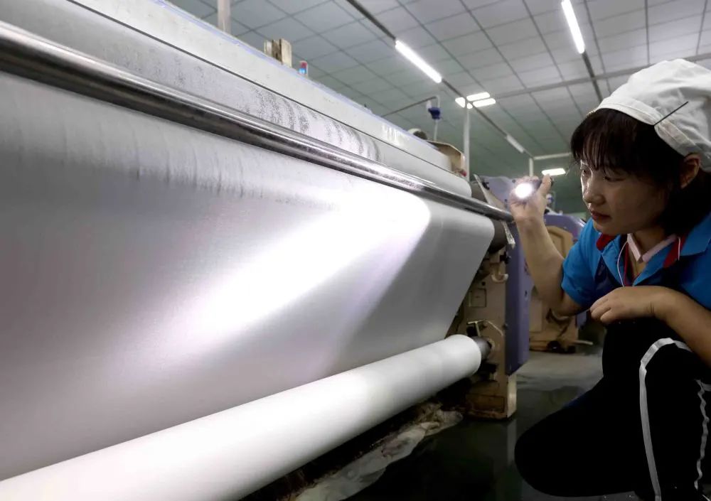 在河南省邦维高科特种纺织品公司第一车间,工人在生产线上检查刚刚生产出来的一种具有高抗撕裂性的获得发明专利的特殊面料(5月14日摄)。