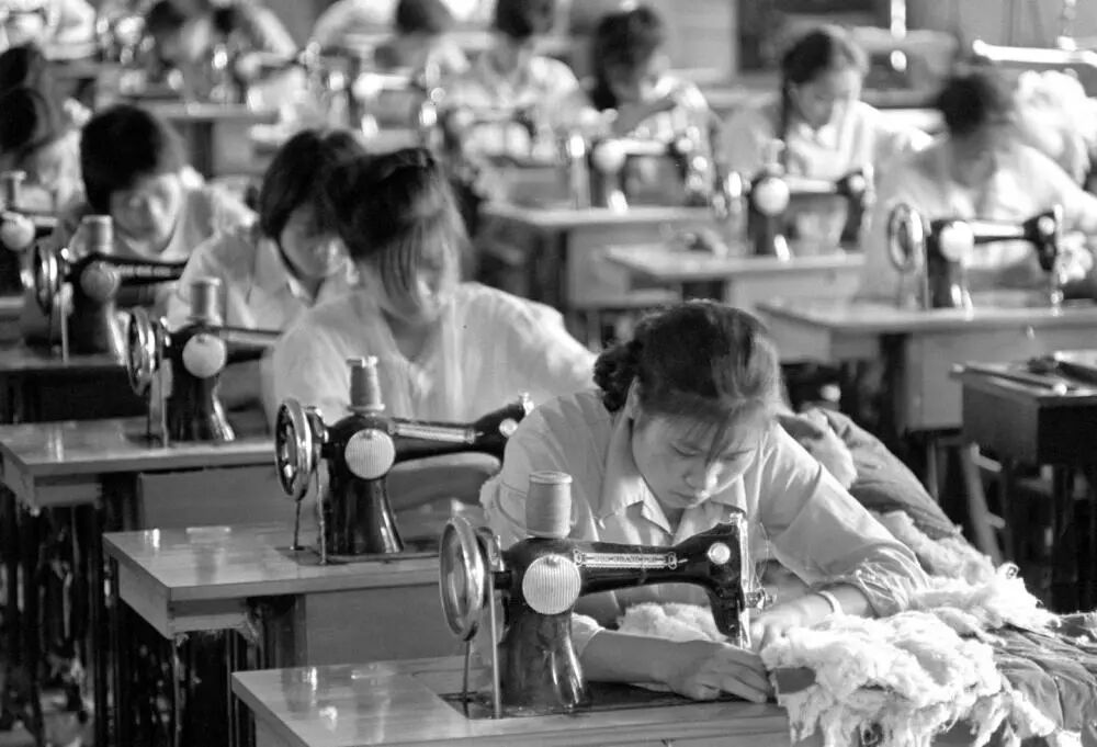 1985年拍摄的四川省新津县扶贫服装厂的工人正在加工服装。(新华社记者孙忠靖摄)