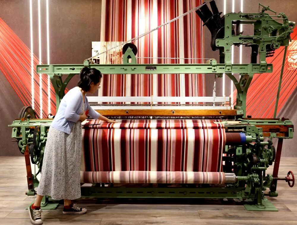 在江苏阳光集团,一名公司员工在企业展示厅观看第一代国产织布机(5月25日摄)。