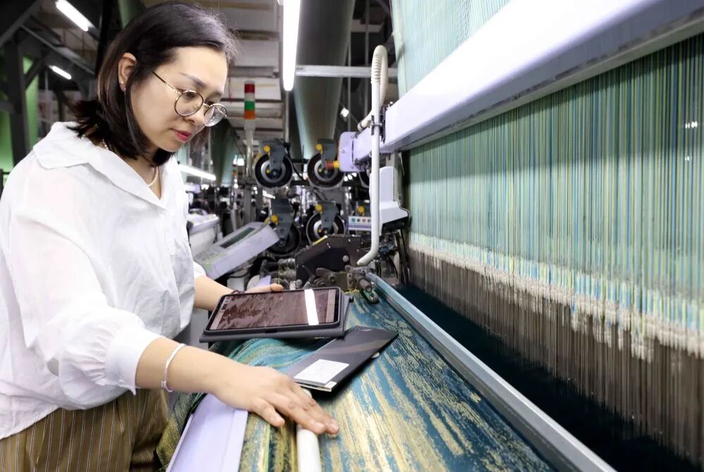 在位于浙江省新昌县的达利丝绸(浙江)有限公司成品智能检验车间,设计师在对成品面料进行最终校对核准(5月22日摄)。