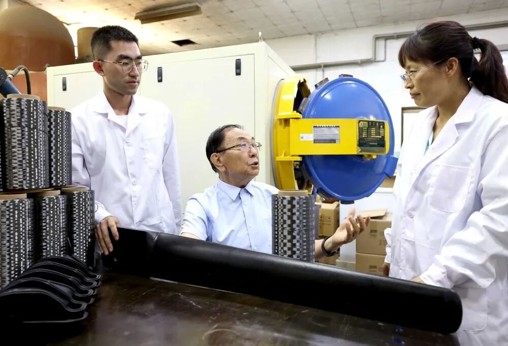 中国工程院院士、力学和复合材料专家杜善义教授(中)和北航李敏教授(右)等在北京航天航空大学聚合物基复合材料实验室就碳纤维有关问题进行交流(6月10日摄)。