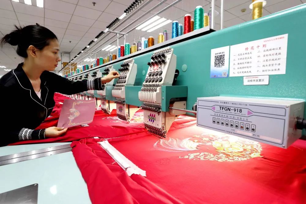工人在梦洁集团总部长沙麓谷工业园绣花车间检查成品绣花纹样(5月27日拍摄)。