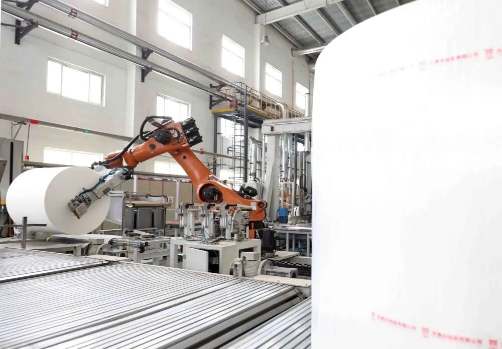 在山东省德州市临邑县天鼎丰非织造布公司第一车间1号聚酯长丝无纺布生产线,机器人将聚酯胎基布运至包装台(5月16日摄)。