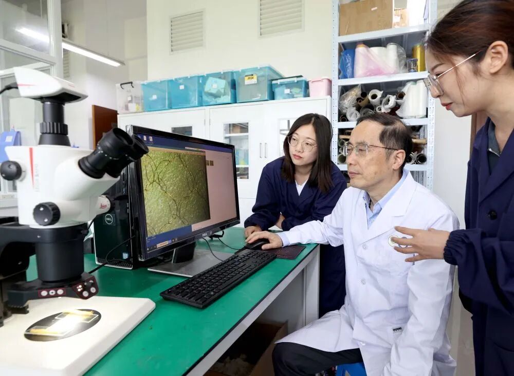 东华大学副校长、材料专家陈南梁教授(右二)与其博士、硕士研究生在东华大学纺织科创中心实验室分析大型可展开星载天线金属网反射面材料的细观结构。(5月21日摄)。
