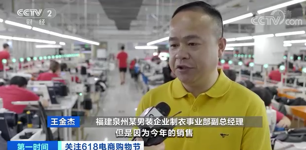 福建泉州某男装企业制衣事业部副总经理王金杰:“我们前期已经备了几十万件的货,但是因为今年的销售非常好,现在每天加班加点赶618大促的货。”