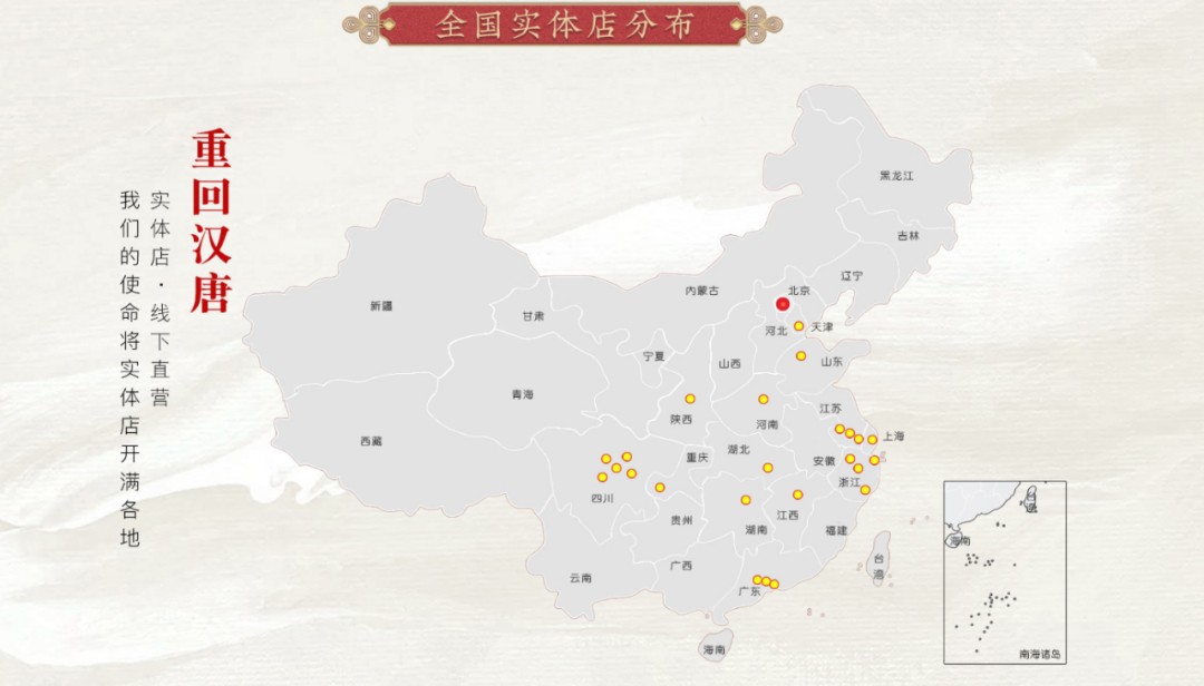 2006年底,重回汉唐在成都仿古商业街文殊坊开出首店,目前重回汉唐已有实体店30余家,其中成都店4家。