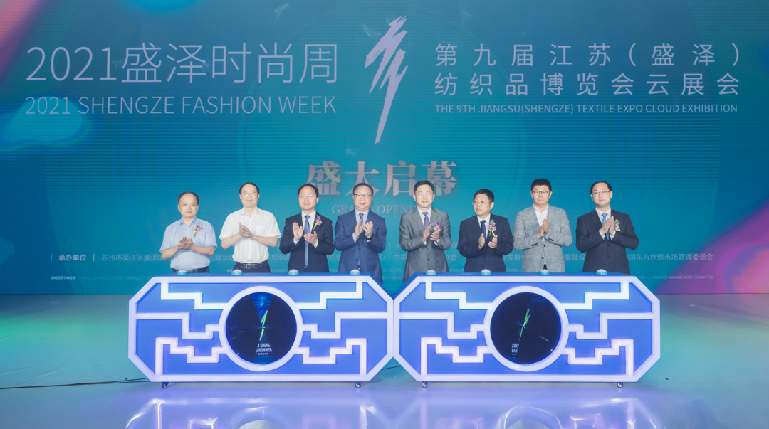 中国纺织工业联合会副会长徐迎新,吴江区人大常委会主任徐晓枫,苏州市商务局副局长、贸促会会长徐联全,吴江区副区长陈建忠,中国纺织品进出口商会副秘书长肖领,吴江高新区管委会主任、盛泽镇党委副书记、镇长徐惠林,江西服装学院副院长易城共同启动第九届江苏(盛泽)纺织品博览会云展会暨“五五购物节”上线仪式。
