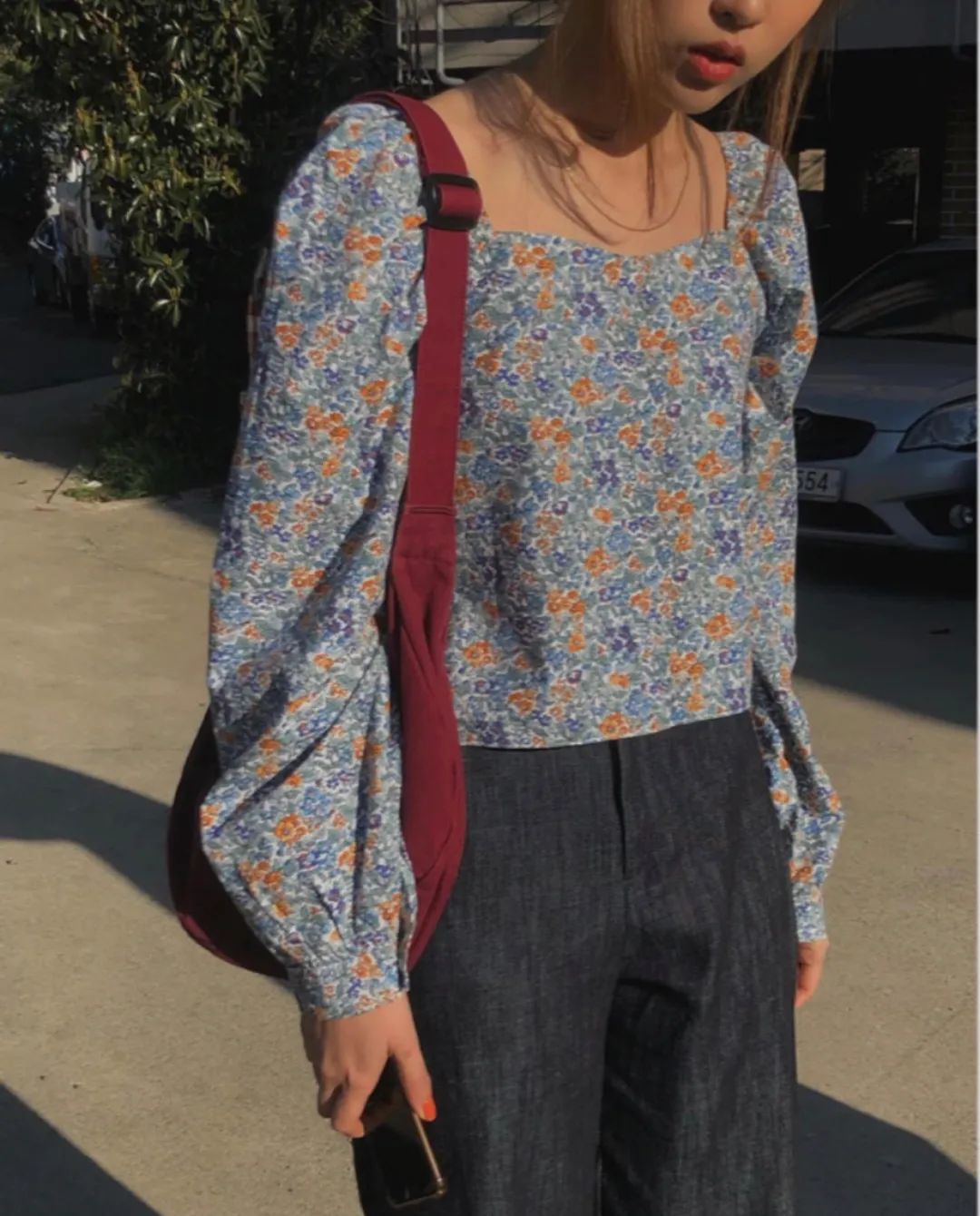 碎花上衣配上纯色裤子,一繁一简,清新可人。