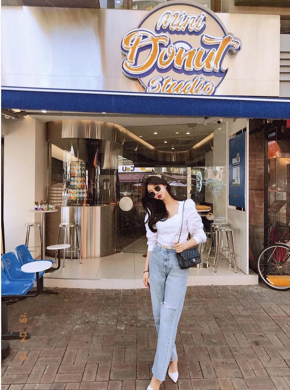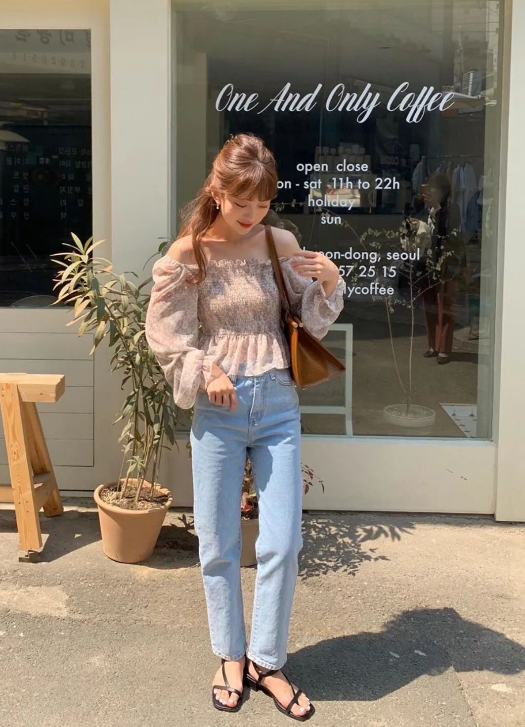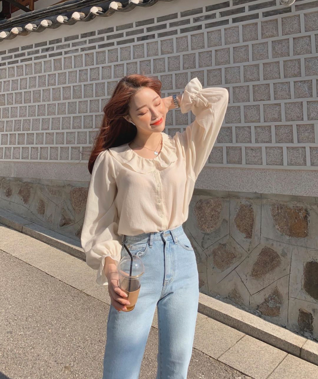 白色干净的法式衬衫,配上淡色破洞直筒裤,上班or约会随意切换。