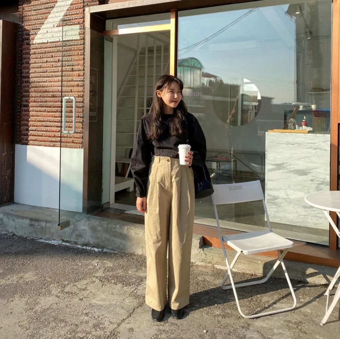 怕衬衫和阔腿裤都是太过宽松的版型显得太膨胀,pick黑色的法式衬衫更显瘦。
