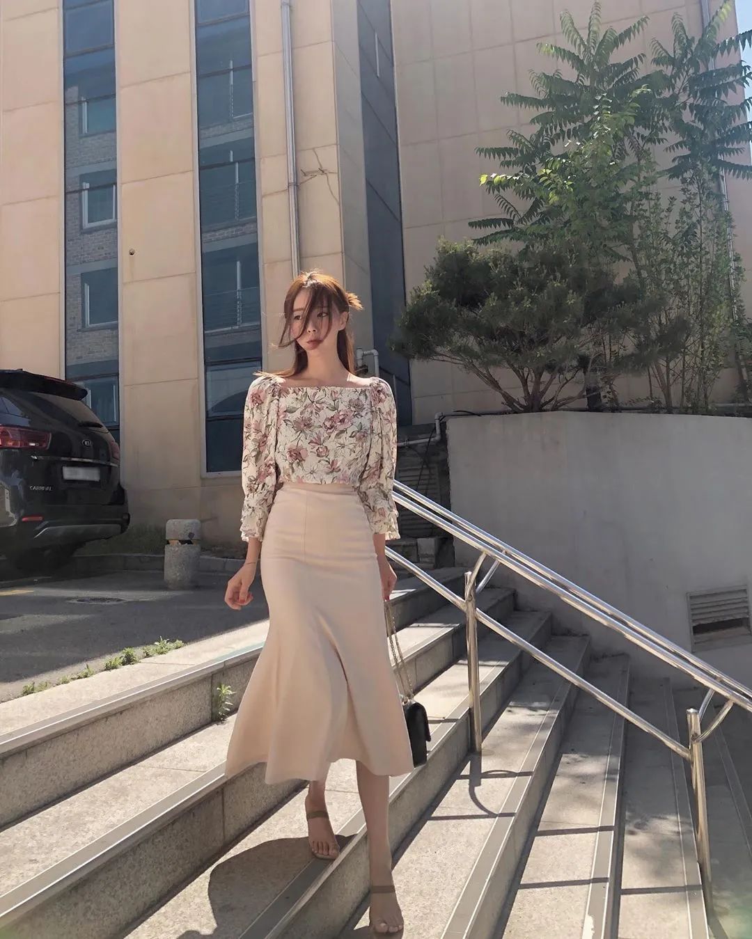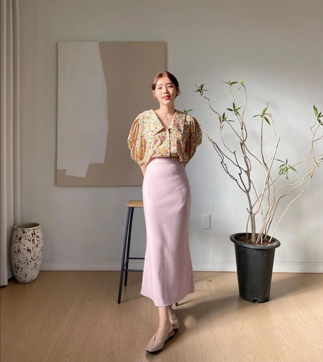 浪漫的法式碎花衬衫,配上一条刚刚好垂顺的半身长裙,简直就是精致高雅本人。
