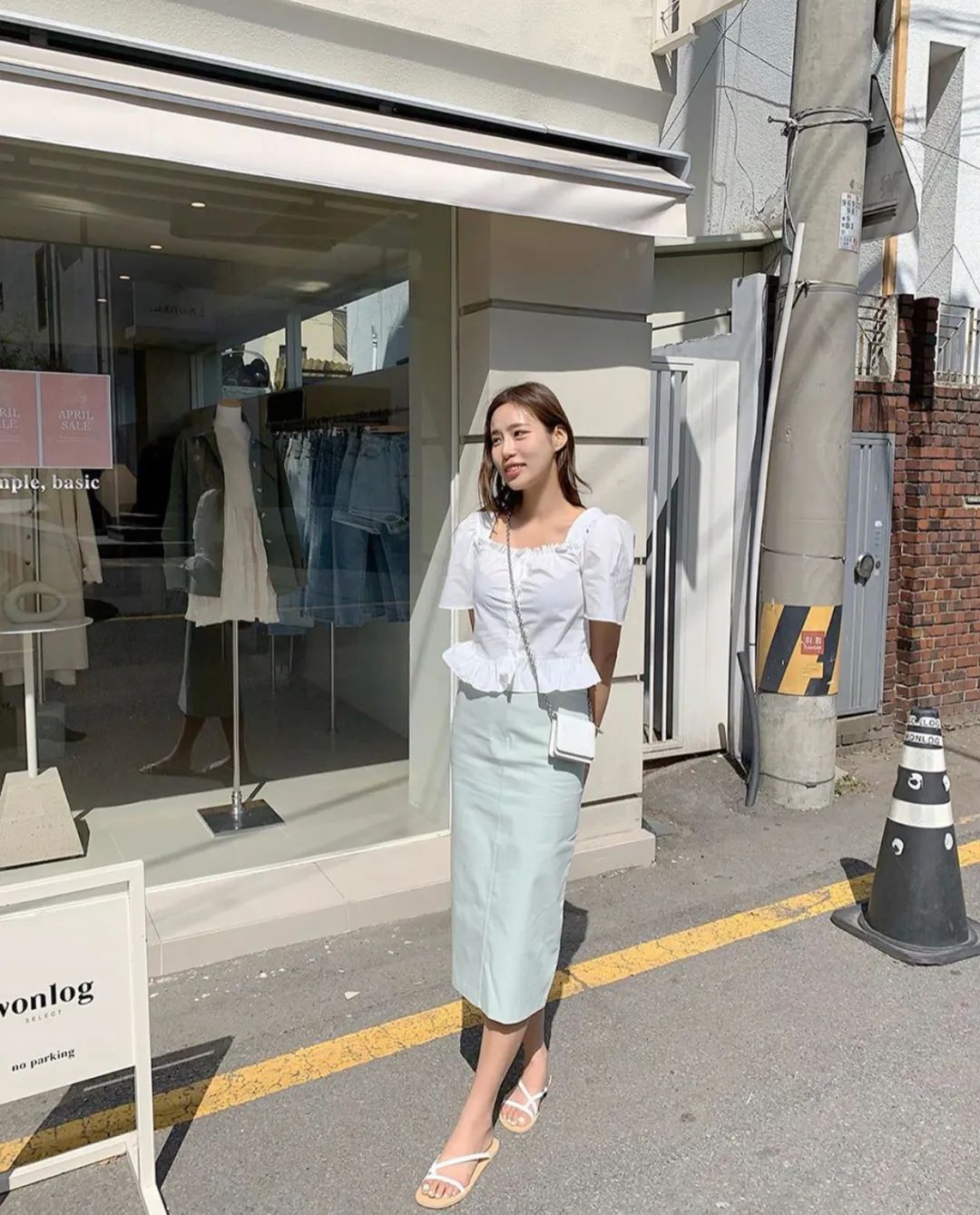 薄荷绿的法式衬衫配上白裤子,色系的穿搭就很舒服,青春洋溢的感觉。