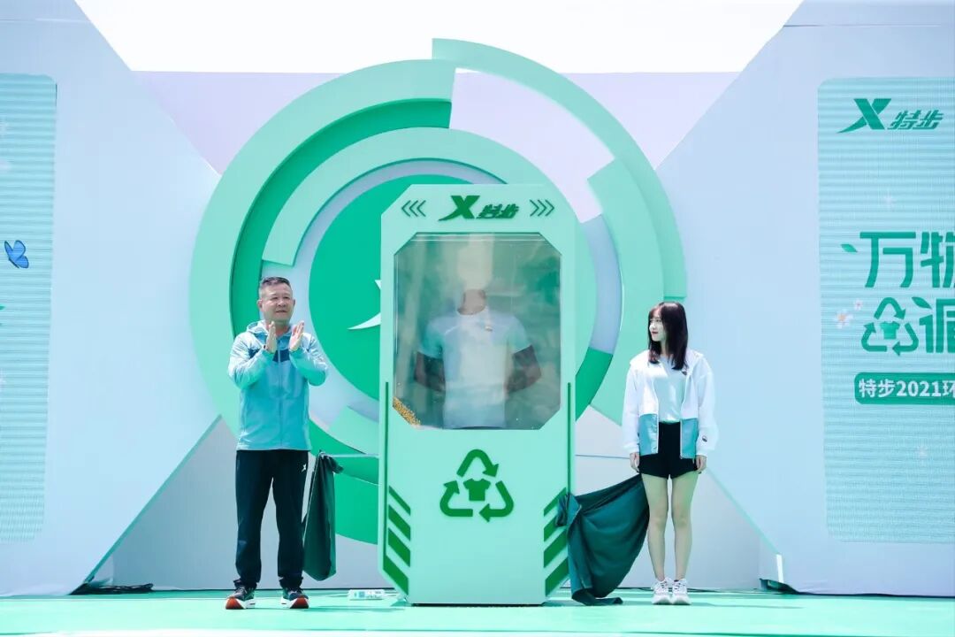 特步集团总裁丁水波(左)与特步环保大使丁佳敏共同为特步聚乳酸新品T恤首发揭幕。