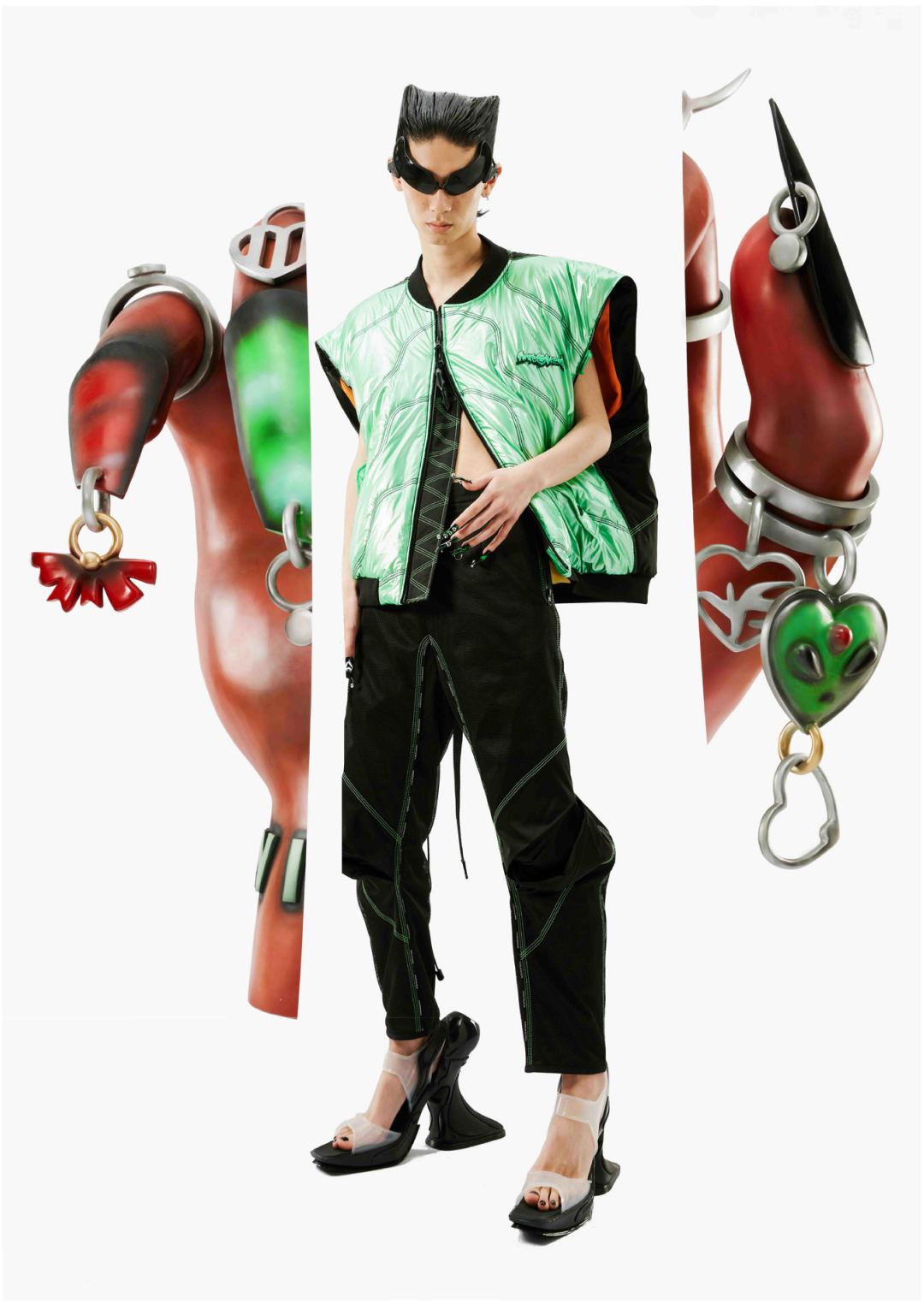 为了体现外星人入倾人类世界还模仿了人类行为的诡异感,服装以反光面料拼接,为系列注入强烈的虚拟科幻气息,迎合#weirdwideweb古怪互联网趋势 ; 抽绳细节被用来创造量感廓形,原本就带有蓬松感的羽绒服,袖口也刻意加长让视觉单品更夸张吸引眼球。