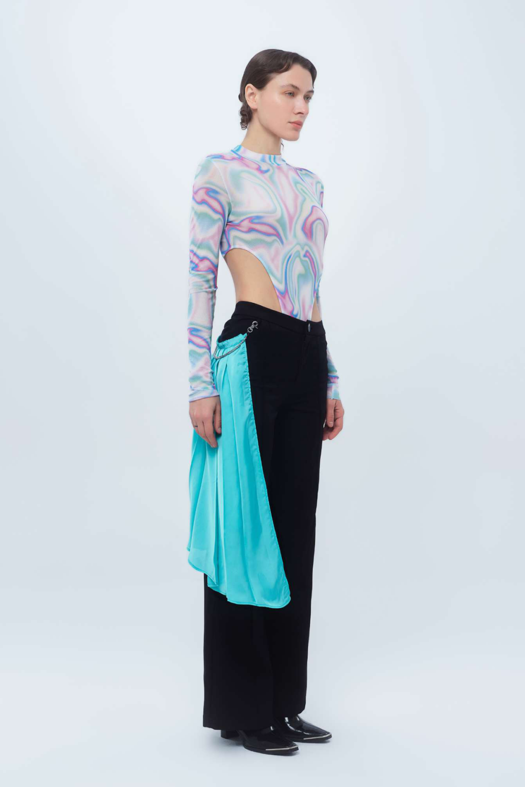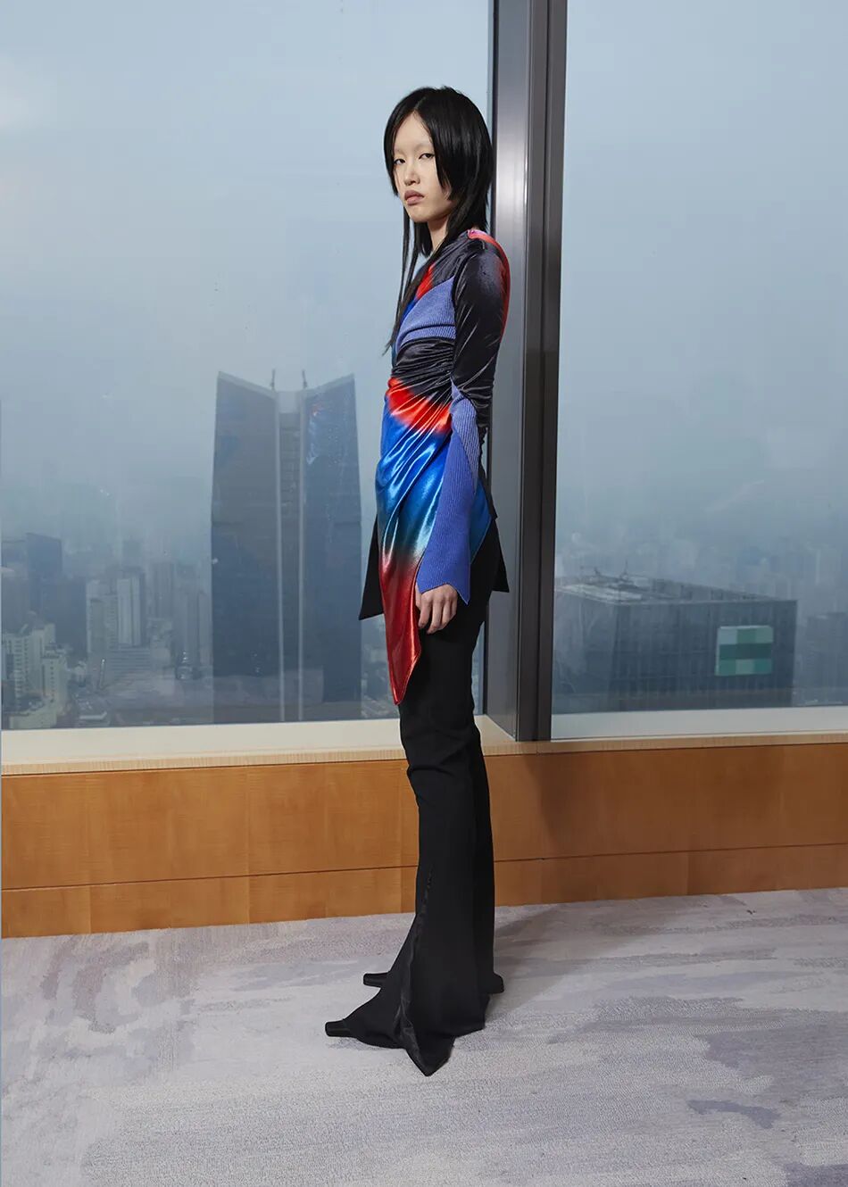 以#patternplay玩转剪裁和科幻风格结合,体现前卫性感美学,是Didu最擅长的创作手法 ; 本季更融入了《⻄部世界》的元素,将西部牛仔服上必备的十字交叉结成为皮革外套腰部装饰,打造新颖效果。加入抽绳效果的长版上衣与#digitalfilter数字滤镜印花结合,则散发微妙的暗黑气息。