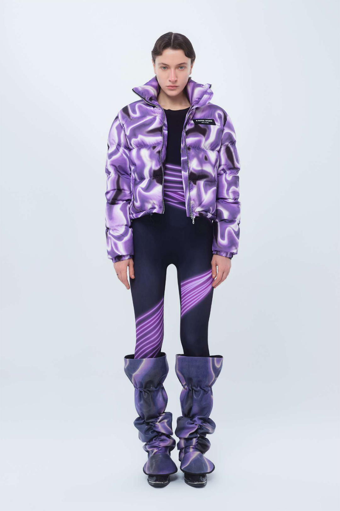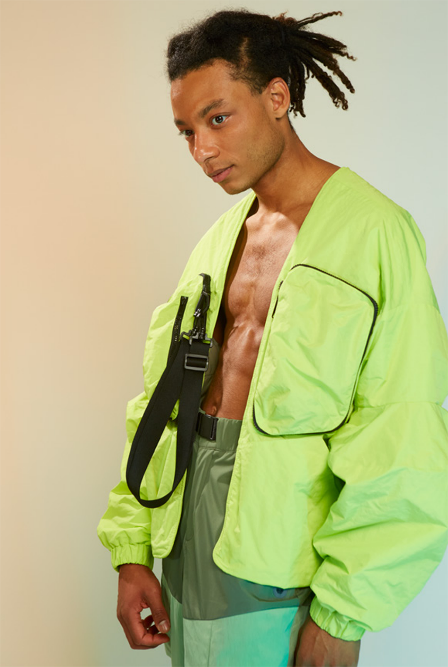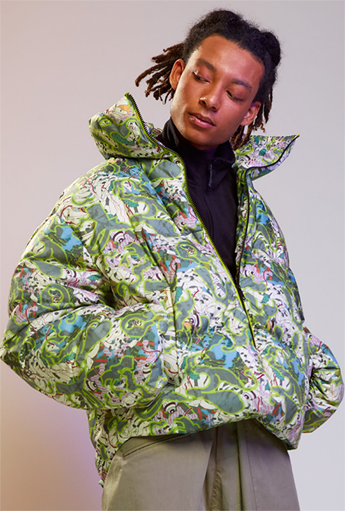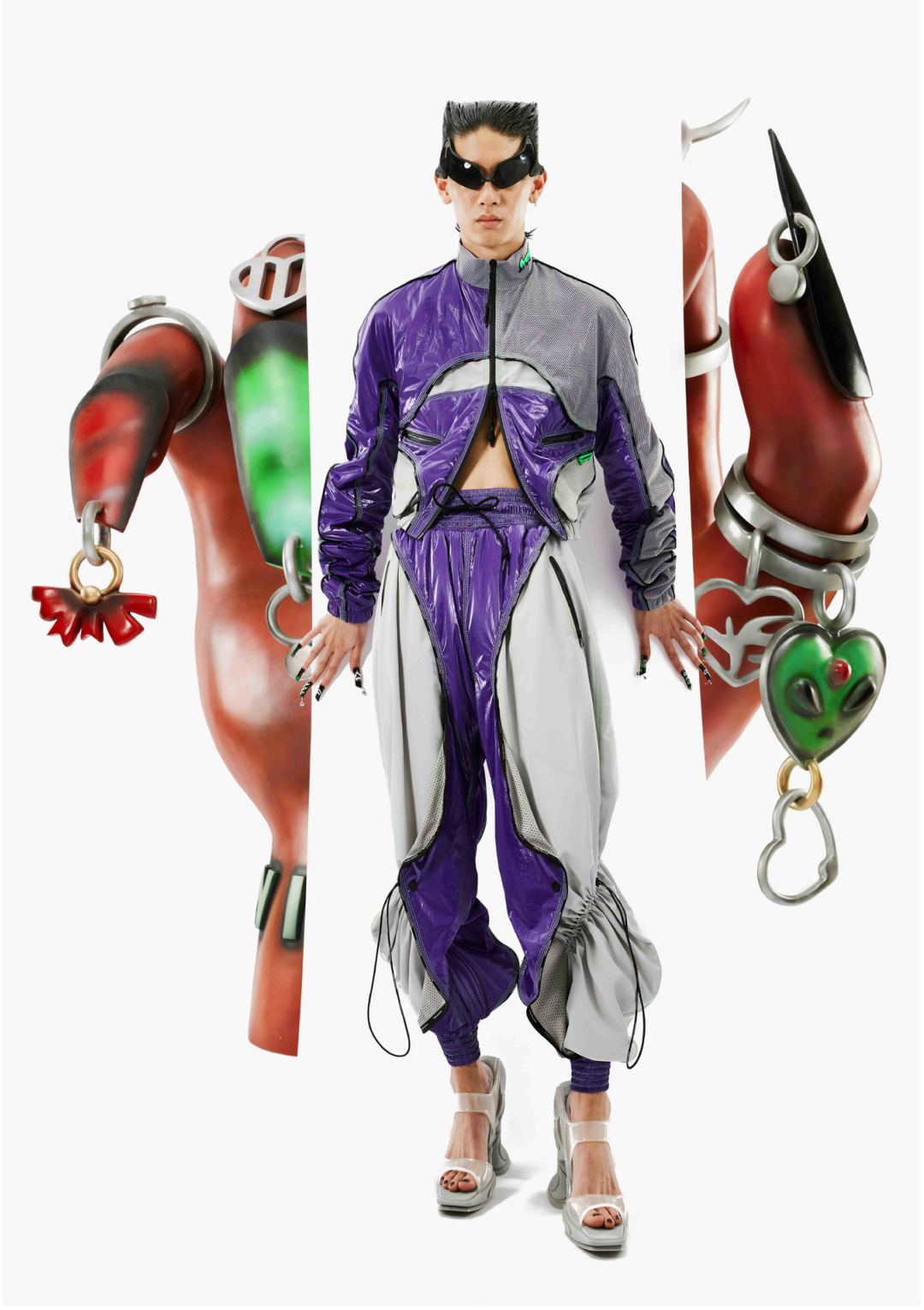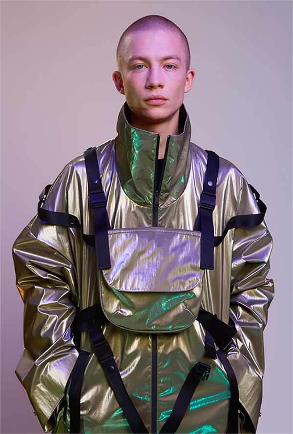 本系列特别选用反光材质和荧光色板,糅合抽象印花演绎科幻氛围。