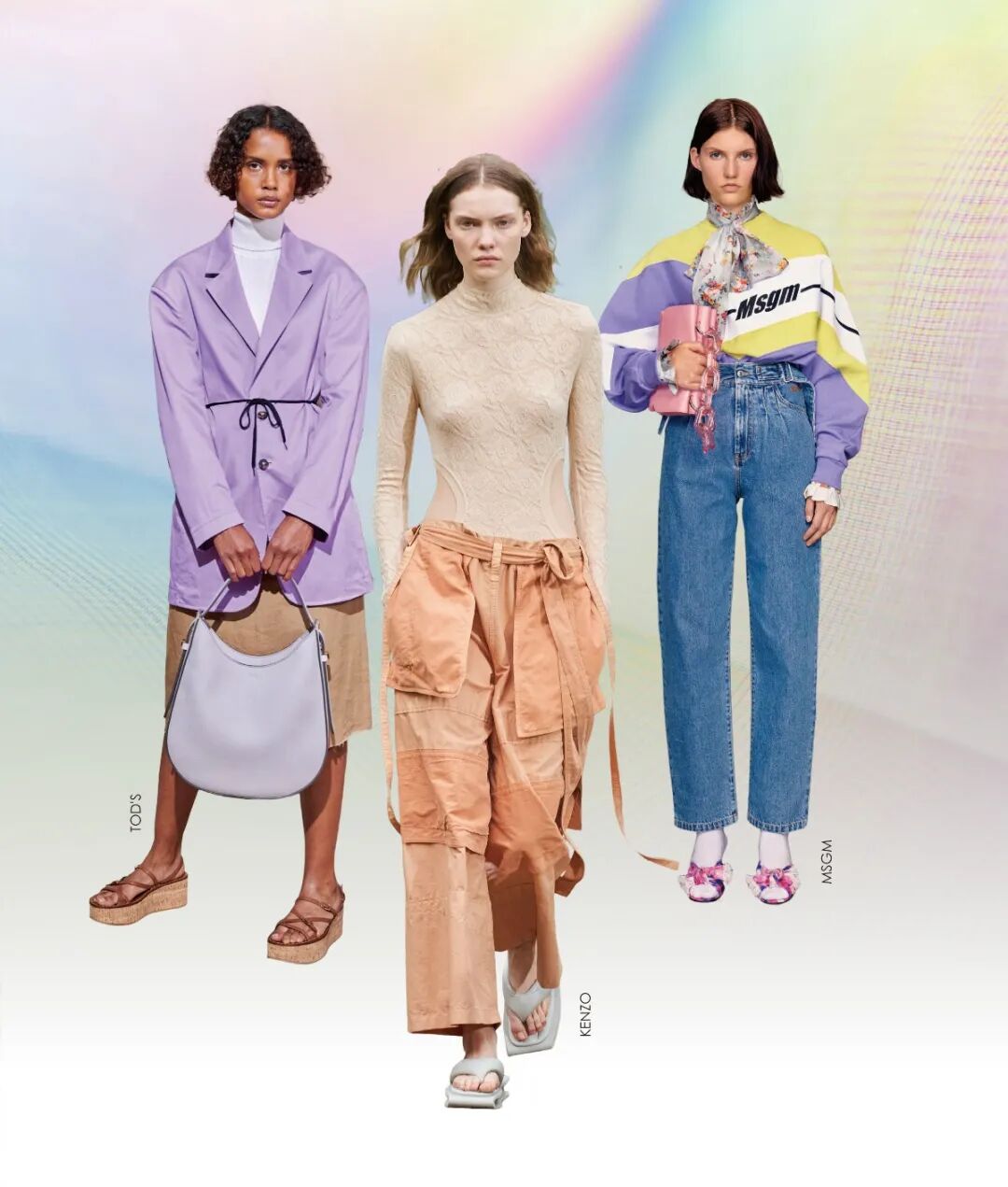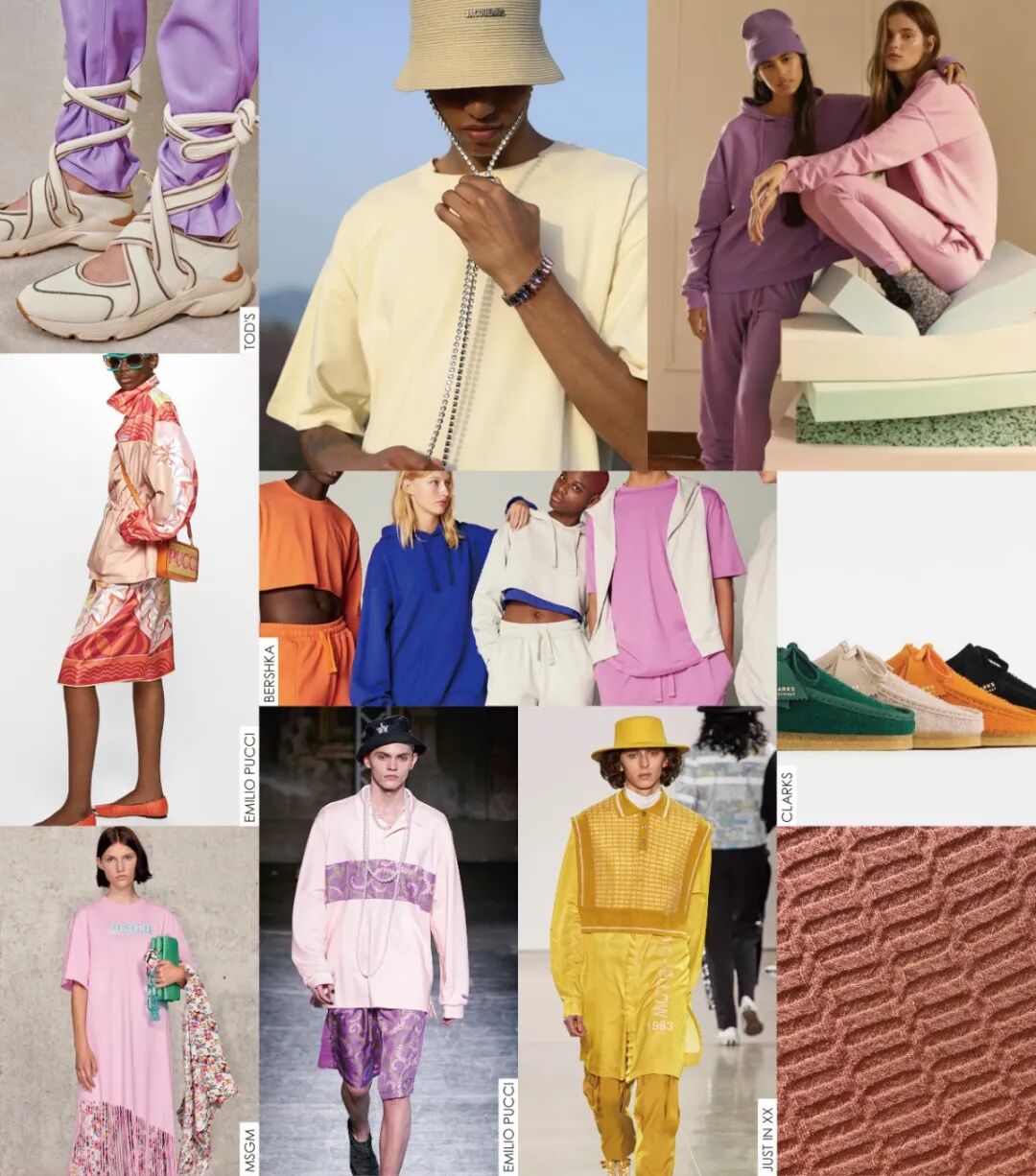 时尚透过一种温暖、关爱、舒适、多彩的滤镜重新描绘生活,唤醒感官活力,触发自由悸动的夏日情怀。色彩在这个方向下尤其重要,富有“日常”之美的新粉彩色系为夏日运动风格增添趣味性,营造欢愉轻松的宜人氛围。纯色圆机针织卫衣外观细腻且触感舒适,是青年群体的最爱;多彩的夏季棉布略带光泽感,为外套及裤装造型带来更多可能;丝质的提花面料更新常规校园套装。搭配俏丽的花卉纹样图案,跨性别设计一览无遗。