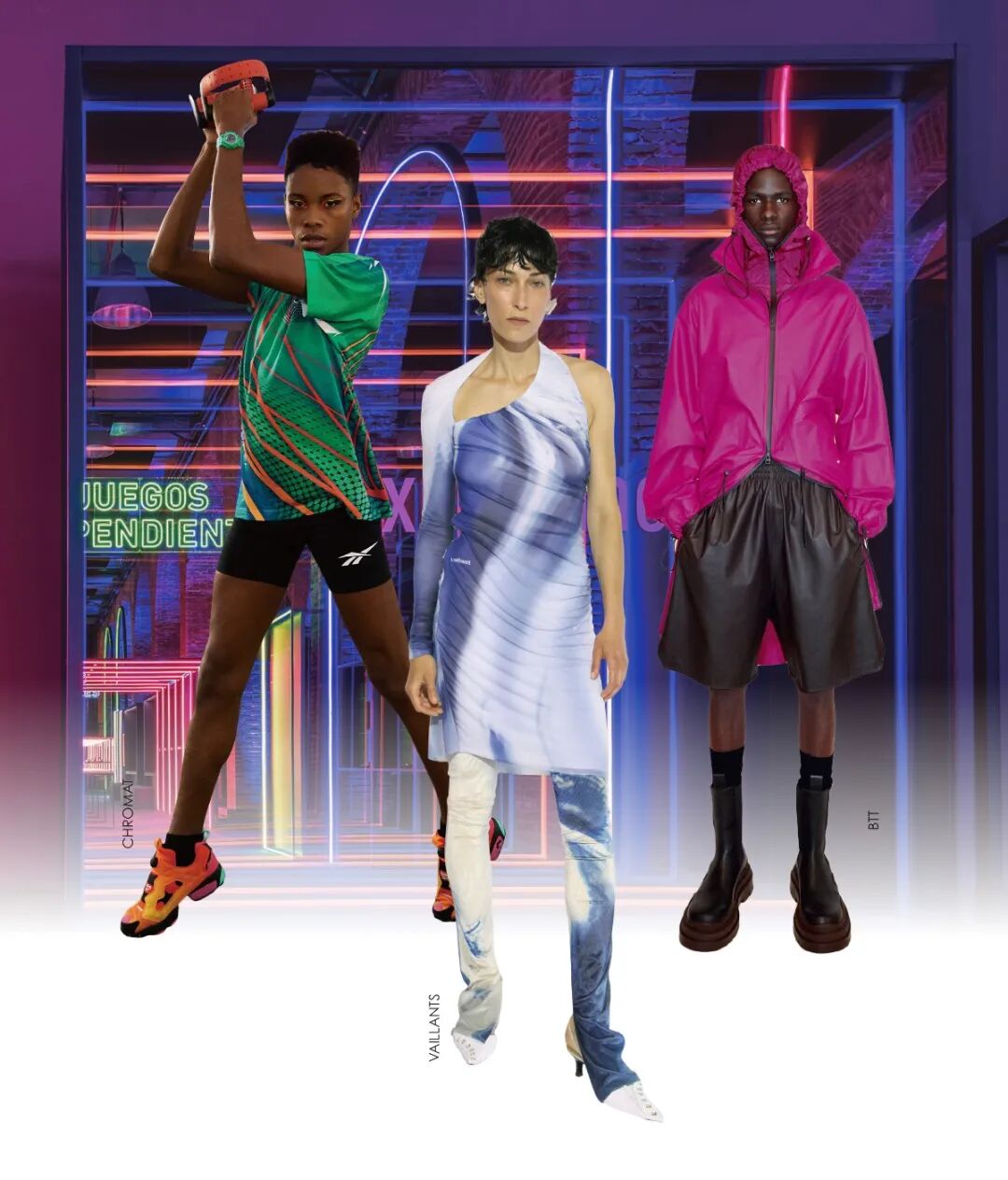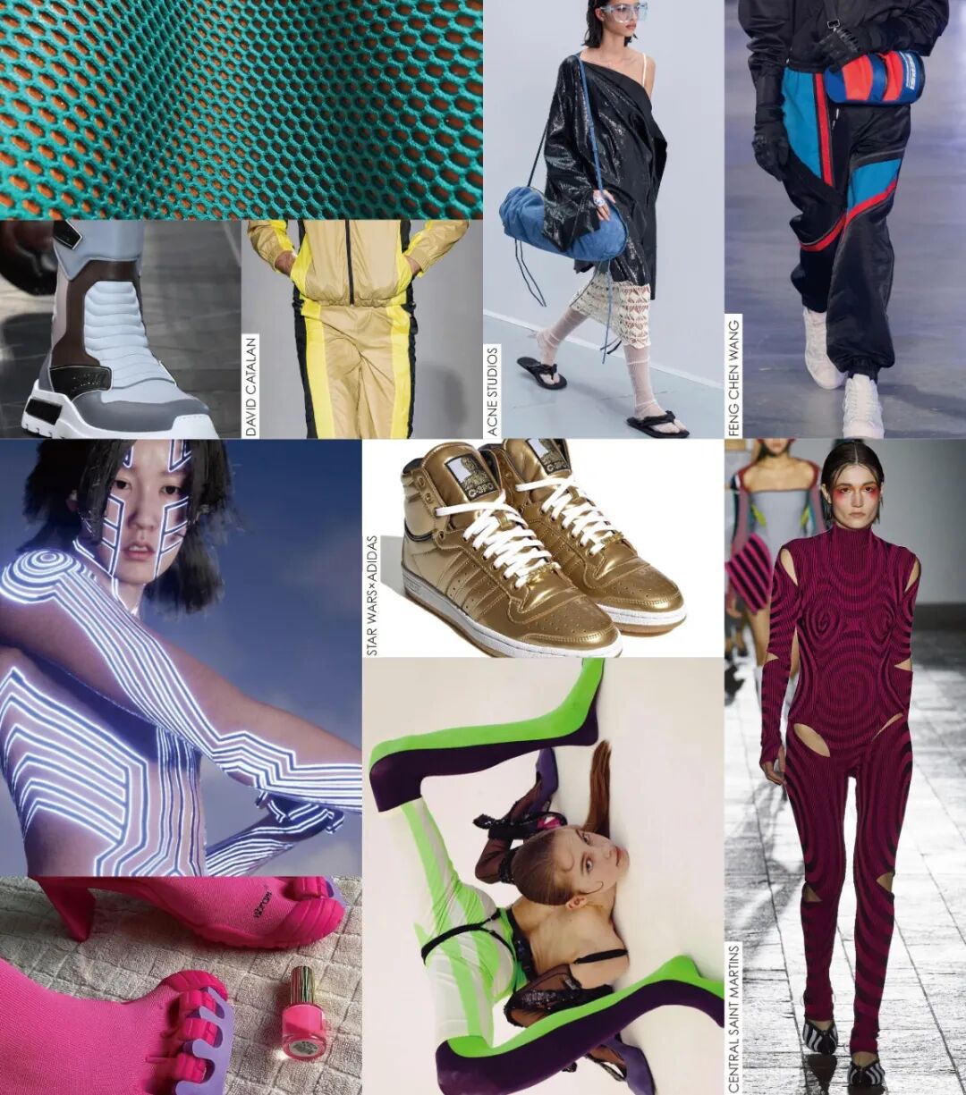 数位科技、电竞、扩增实境、人工智能蓬勃发展!未来时代的数字化定义,在前沿运动风格上尤为明显。几何变形、数字电波、柔焦效果、3D视幻、像素化等几何或花卉图案通过提花、印花或复合工艺,实现对数字世界的多样表达。超饱和色彩和夸张丰富的印花完美契合逃避现实主义基调,为潮流单品注入顽趣个性和欢快动感。关注暗黑感的亮彩色、数字亮色与酸性强调色的碰撞,大胆的色块拼接与抽象化的图案设计,呈现振奋不羁的电光感。