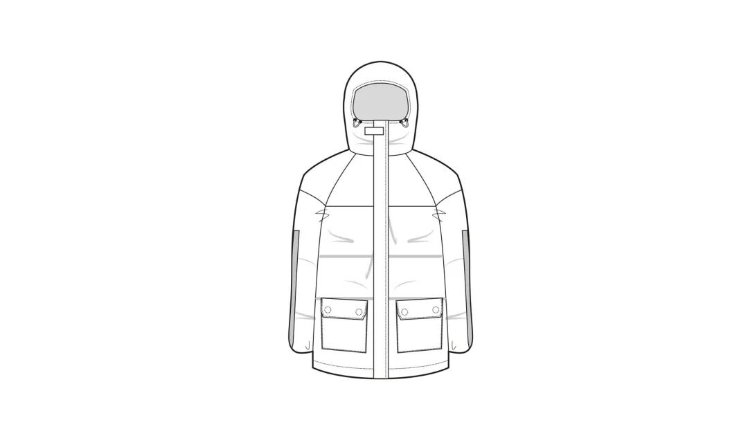 大兜帽搭配加长衣领和正反松紧调节纽扣。魔术贴扣合能固定顶部拉链。对比面料加固,能增强前臂衣袖背面的耐磨性。贴袋采用磁力扣合设计。宽立衬。