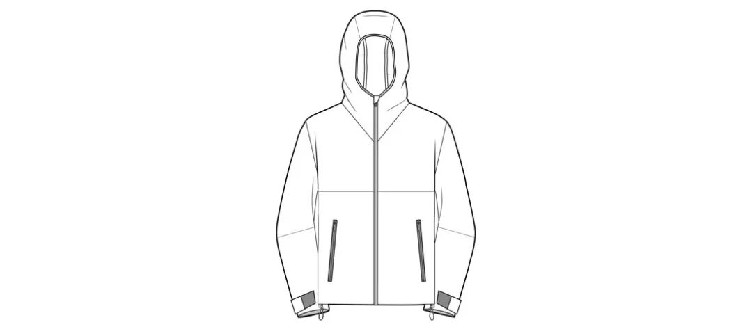 常规版型、防水透气性、全包缝线、防水拉链。衣袖处添加宽魔术贴调节带。大兜帽背部有调节纽。内外口袋。