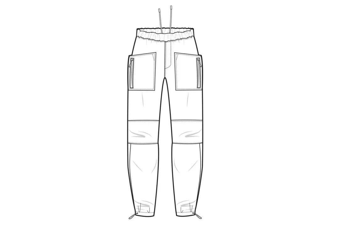 松紧裤腰内部有拉绳。贴袋顶部采用拉链设计。膝盖添加立裁布片。锥形裤脚可调节松紧。