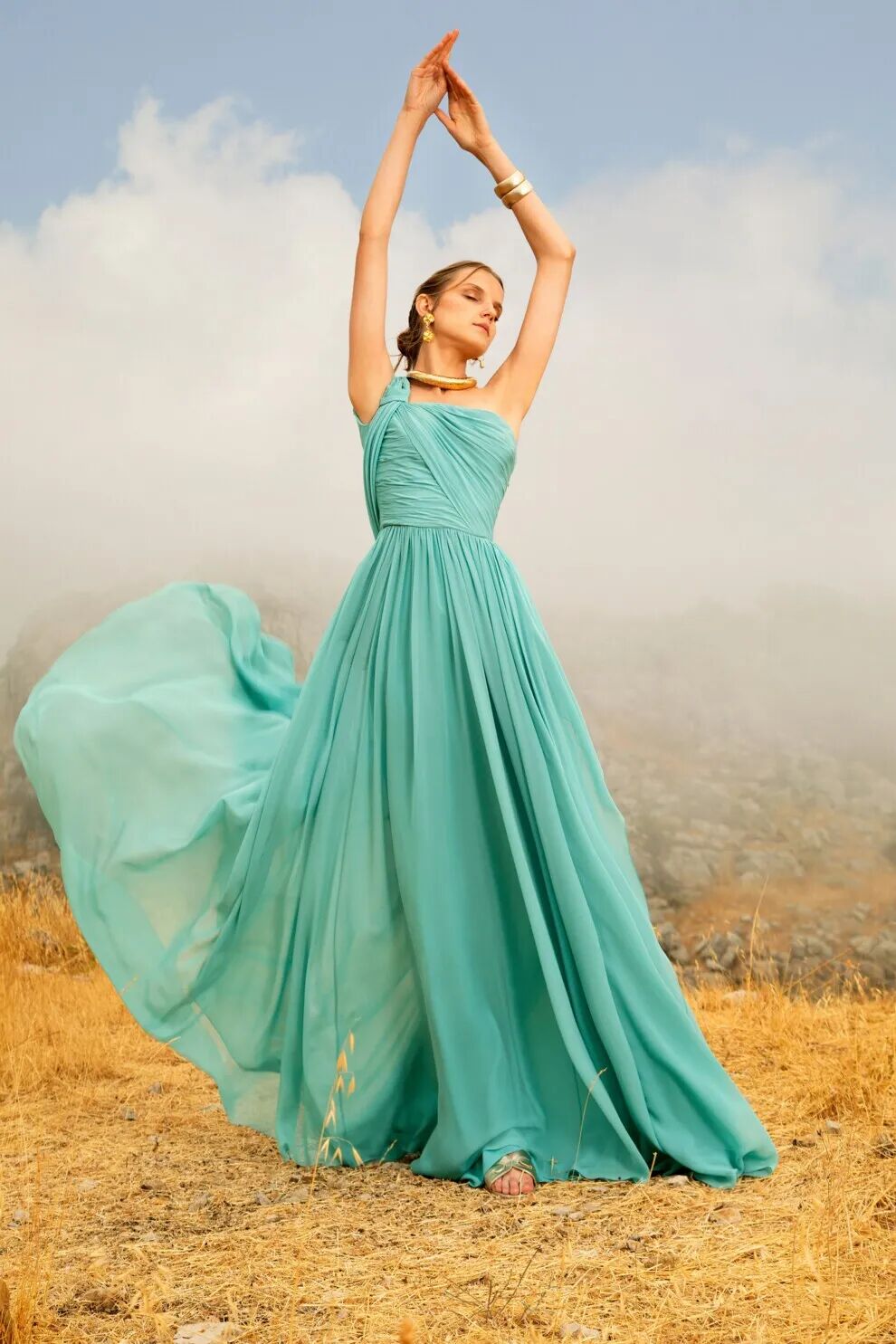 而Elie Saab展示了一种由精致丝绸制成的女性化飘逸连衣裙。