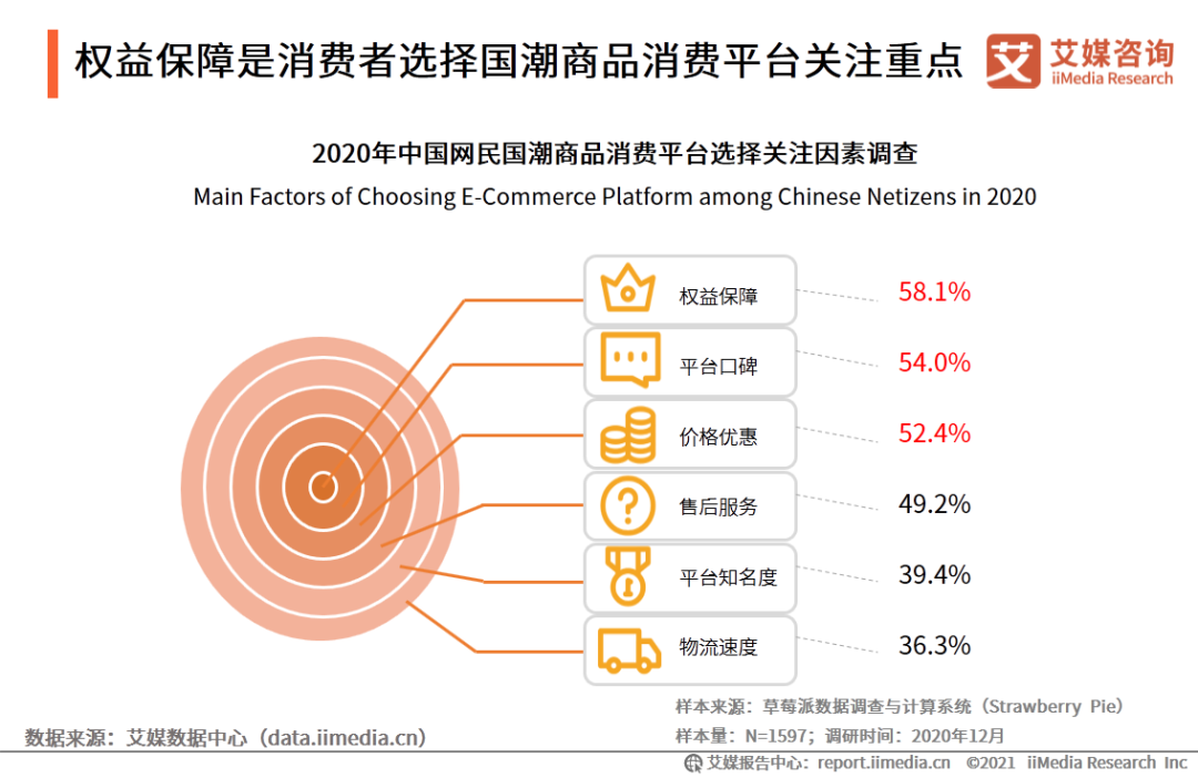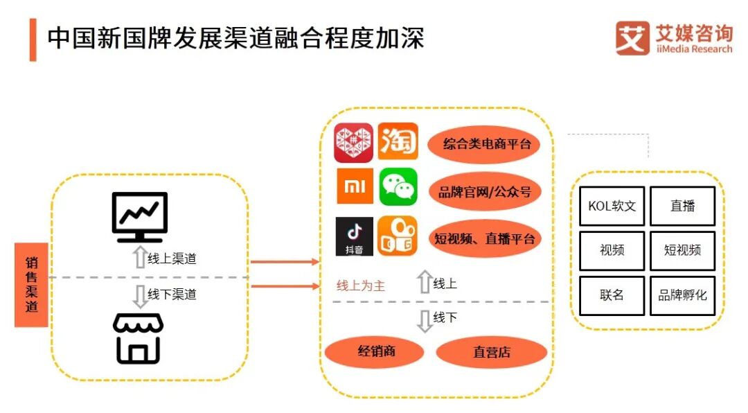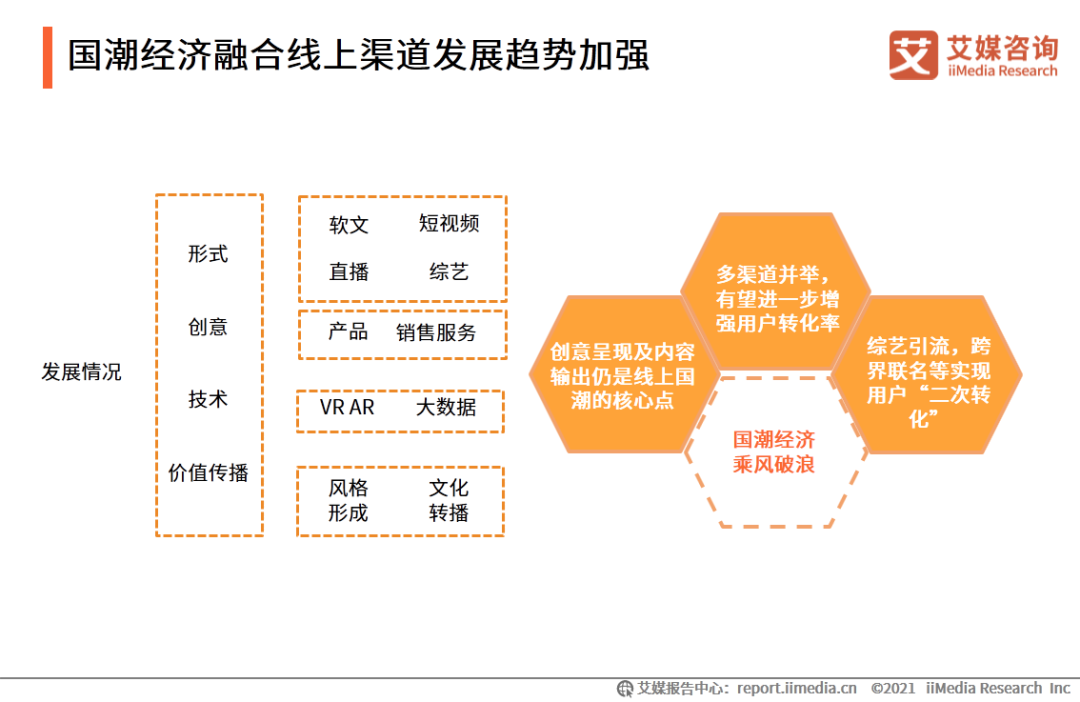 2020年疫情对全球经济形成冲击,中国成为最早复苏的国家,为国潮经济的发展奠定了良好的势头。国潮因结合时尚设计风格、多元化营销手段,同时又以品牌为载体应用至各品类商品中,并将中华传统文化融合到现代潮流元素,形成了一股强大的浪潮。另一方面,跨境电商供应渠道收缩无法维持正常货运水平,居民需求向内转移。而中国供给侧方面已做好长期改革部署,2020年中央政治局常委提出“双循环经济”,进一步发挥国内市场优势同时扩大内需,国潮经济有望借此机遇更好地与国际品牌进行竞争。此外,民众对于国家和民族认同感日益提升,也使其对国货品牌和商品的支持度提高,为国潮经济发展提供良好的社会环境。目前90后和00后逐渐走向消费舞台中央,其对新事物的接受能力更强,意愿更旺盛;该世代消费者拥有强烈的自我表达诉求,更加具有文化理性、追求质量、热衷创意;而且,国民信息接受范围更广泛,信息内容更密集,信息渠道更多元化;国内消费风格返璞归真,由追求奢侈品牌向简约、性价比转变。目前,中国国货主要采用线下+线上双渠道融合模式,近年各品牌逐步将销售重点向线上倾斜,除了自营官方购物平台外,陆续入驻各大电商平台。除了常规营销,还有直播带货、跨界营销等多种线上模式。其他合作模式还包括与头部电商合作推出渠道专供产品,小品牌接受企业资金或商业模式方面的扶持等等。值得注意的是,国潮经济近年结合线上渠道发展迅速,2020上半年数家以电商渠道为主的国产消费品牌成功拿到数亿金额融资,下半年国潮与电商的合作仍不停涌现,未来国潮品牌与线上渠道的融合将继续深化。线上国潮营销渠道涉猎广泛,以直播、短视频为主,因国潮商品相对吸睛且自带话题性,多平台营销扩大用户流量同时提升用户转化率。艾媒咨询分析师认为,随着中国工业生产配套链逐步完善,国内品牌商家生产产品质量水平得到持续提升。从最初的家电、服饰等行业开始,中国品牌商品在市场的竞争力不断提升,也使更多消费者将选择投向国货,质量的提升是促进国潮经济迅猛增长的重要动力。六成网民偏好从线上渠道消费国牌商品,电商平台成国潮商家重要服务平台目前,国潮经济主要在国货品牌和国粹两种模式上进行发展。其中,国牌又有新、老国牌之分,老国牌较集中在日化、食品、服饰等行业,新国牌则以技术创新、业务模式创新品牌居多;而国粹则常表现为一种文化或艺术活动,具有更为渊远的发展历史。国潮活动主要有电商类和文娱类,电商平台和直播平台利用体量优势,能大范围推广国风,通过活动、音乐和直播节目让更多人了解中国传统文化。艾媒咨询分析师认为,国潮融合中国的传统文化,国潮活动的兴办能让更多国产优品进入大众的视野,利用流量明星或者平台优势吸引不同群体,可以使国潮商家有机会触达更广泛的消费群体。iiMedia Research(艾媒咨询)数据显示,在选择国潮商品购买平台时,受访网民最关注的三大要素分别为权益保障、平台口碑和价格。可以预见,随着国潮品牌市场影响力提升,其消费受众群体也在不断扩大,对商品正品关注度也在提升,因此相关消费平台对用户的权益保障和自身声誉将影响其对国潮消费者的吸引力。另一方面,消费者对价格重视度也在提升,服务平台的相关优惠活动也能发挥更大的引流作用。从商家服务平台类型来看,主要由电商平台和多个社交媒体平台组成国潮经济发展商家的服务平台;电商平台提供优质交易渠道销售国潮商品,而社交媒体平台主要通过付费推广和自媒体宣传等服务商家;国粹的商业价值逐渐被挖掘,借助电商平台、媒体平台等强大的流量优势,有助于国潮文化大力推广,传统文化的传承。而从细分形式来看,国粹和国牌都是值得关注的两大方面。iiMedia Research(艾媒咨询)数据显示,对于国产品牌购买渠道,受调查的消费者中,62.0%表示喜欢在电商平台购买,55.2%表示喜欢在线上官网购买。艾媒咨询分析师认为,经过长期的市场教育,网民电商消费习惯形成,国牌商品也更多借力电商渠道流量优势触达消费者。国粹方面,iiMedia Research(艾媒咨询)数据显示,六成以上的的受访网民认可将国粹与潮流进行融合有助于传播、弘扬中国文化,四成以上的受调查者则认可此举有助中国经济增长。艾媒咨询分析师认为,随着民众对中华文化认同感和自豪感不断提升,其对于传统文化的传承和输出期待度高,而结合潮流元素和国粹文化的途径更受期待。国潮经济将从垂直市场拓展全领域,年轻群体将释放市场消费潜力国潮经济是在中华文化复兴以及国家崛起的背景下实现快速发展的,加上国潮是将传统文化精华推向消费市场,因此市场的扩大是伴随着文化认同的。随着国潮经济的市场延伸至全球范围,在实现中国优质品牌和优质商品输出的同时,也是中华文化的重要输出途径。现阶段,年轻群体对国家和民族的认同感不断加强,也成为推动国潮在社会上形成文化风潮的重要人群。如汉服市场的发展,年轻人群在其穿着、消费风潮的形成和传播中发挥着重要作用。未来随着95/00后逐步走向经济舞台中央,其有望成为国潮消费主力人群,进一步释放市场潜力。欣喜的是,目前国潮商家愈发重视线上渠道的开拓,众多电商平台自带的流量优势和交易属性,适合传统国牌商家革新转型,同时也为国粹文化和国民IP等