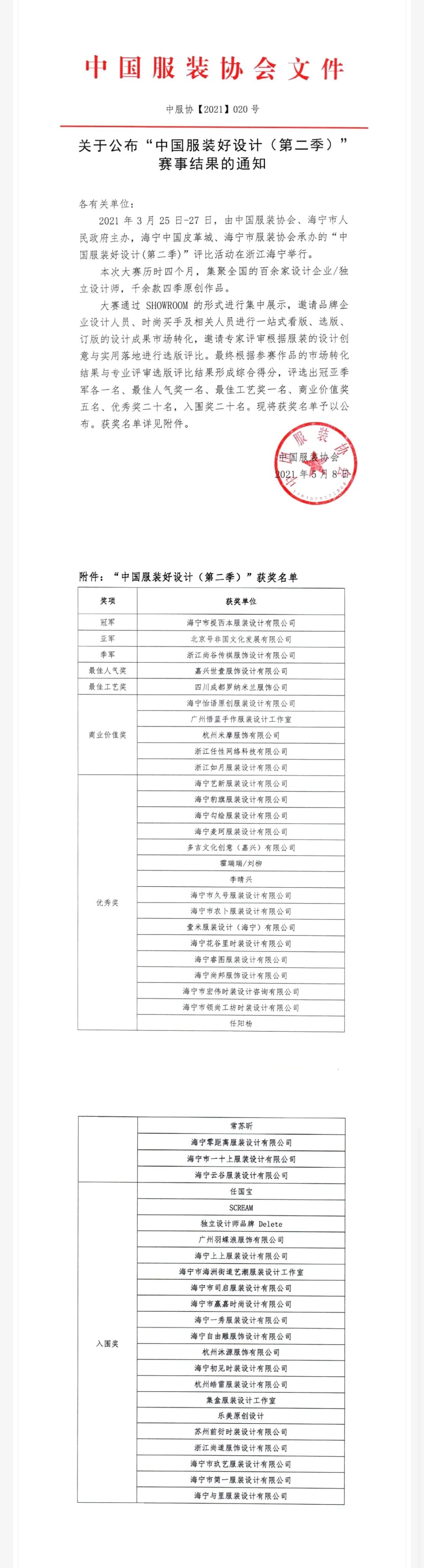 日前,由中国服装协会、海宁市人民政府主办,海宁中国皮革城、海宁市服装协会承办的“中国服装好设计(第二季)”完美落幕。