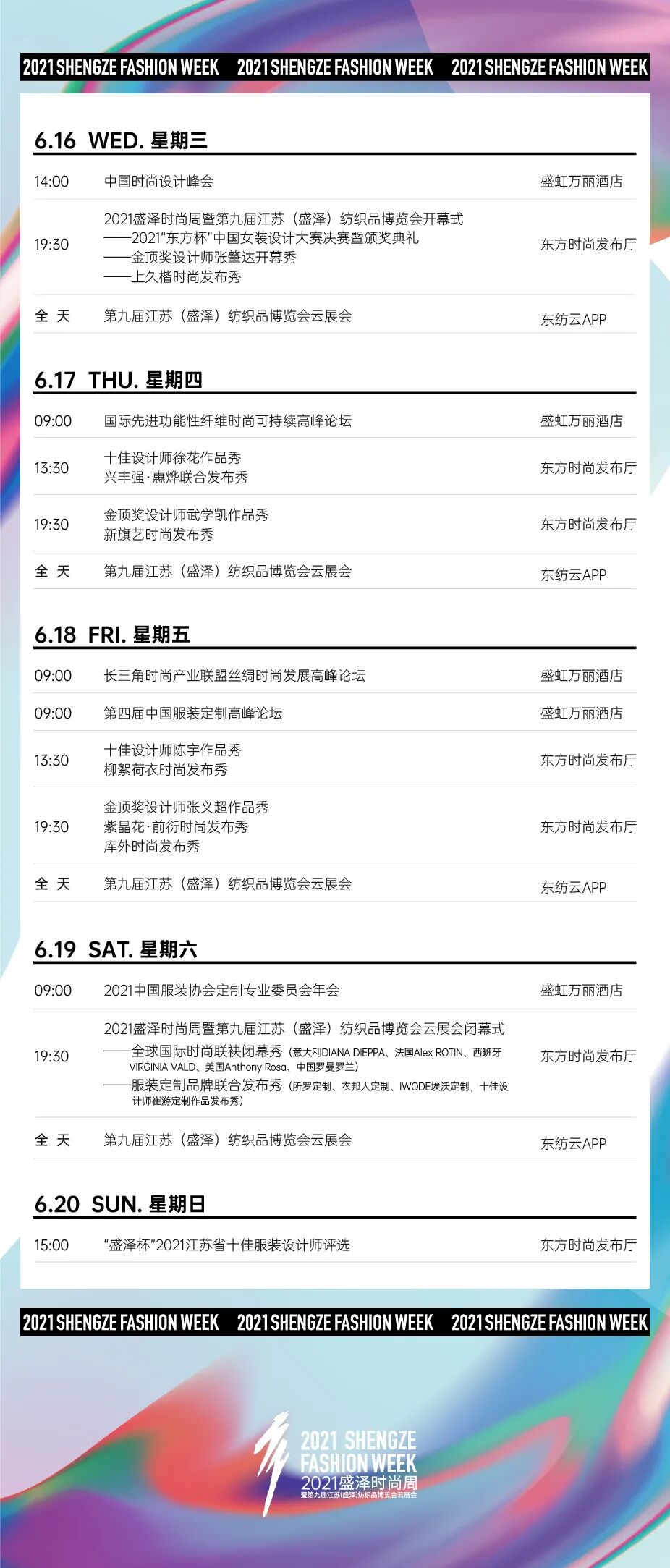 本届时尚周上将呈现23场时尚发布秀、4场时尚云直播、2场时尚设计类赛事、4场行业论坛、1场纺织云展会,线上展示近300家优质商家、万款时尚面料的风采,“秀、展、赛、会、商”五大板块联动,充分展示“时尚之都·美丽盛泽”的产业实力、市场活力、城市魅力,向世界全方位展示盛泽“原产、原创、流行”的时尚特色。