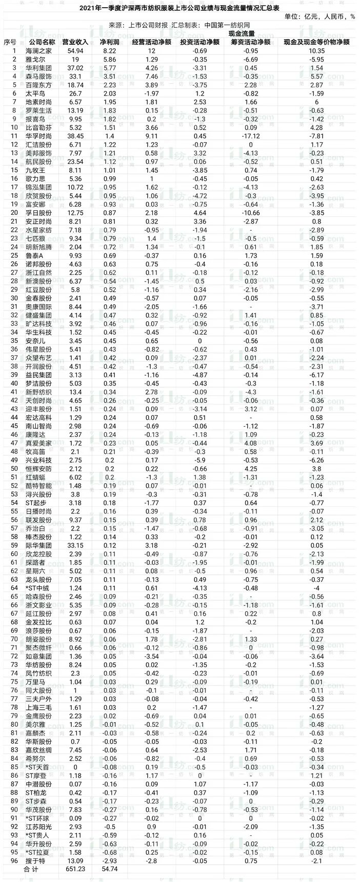 截至2021年3月31日止的一季度,沪深两市96家纺织服装上市公司实现营业收入651.24亿元,归属于母公司的净利润54.70亿元。毋庸置疑的是,海澜之家、雅戈尔、华利集团、森马服饰及百隆东方等头部大厂依然名列前茅。