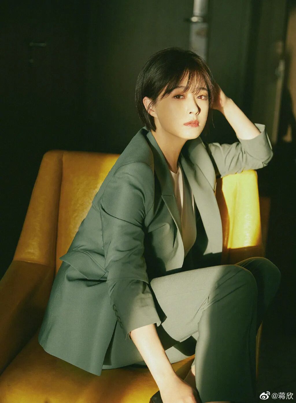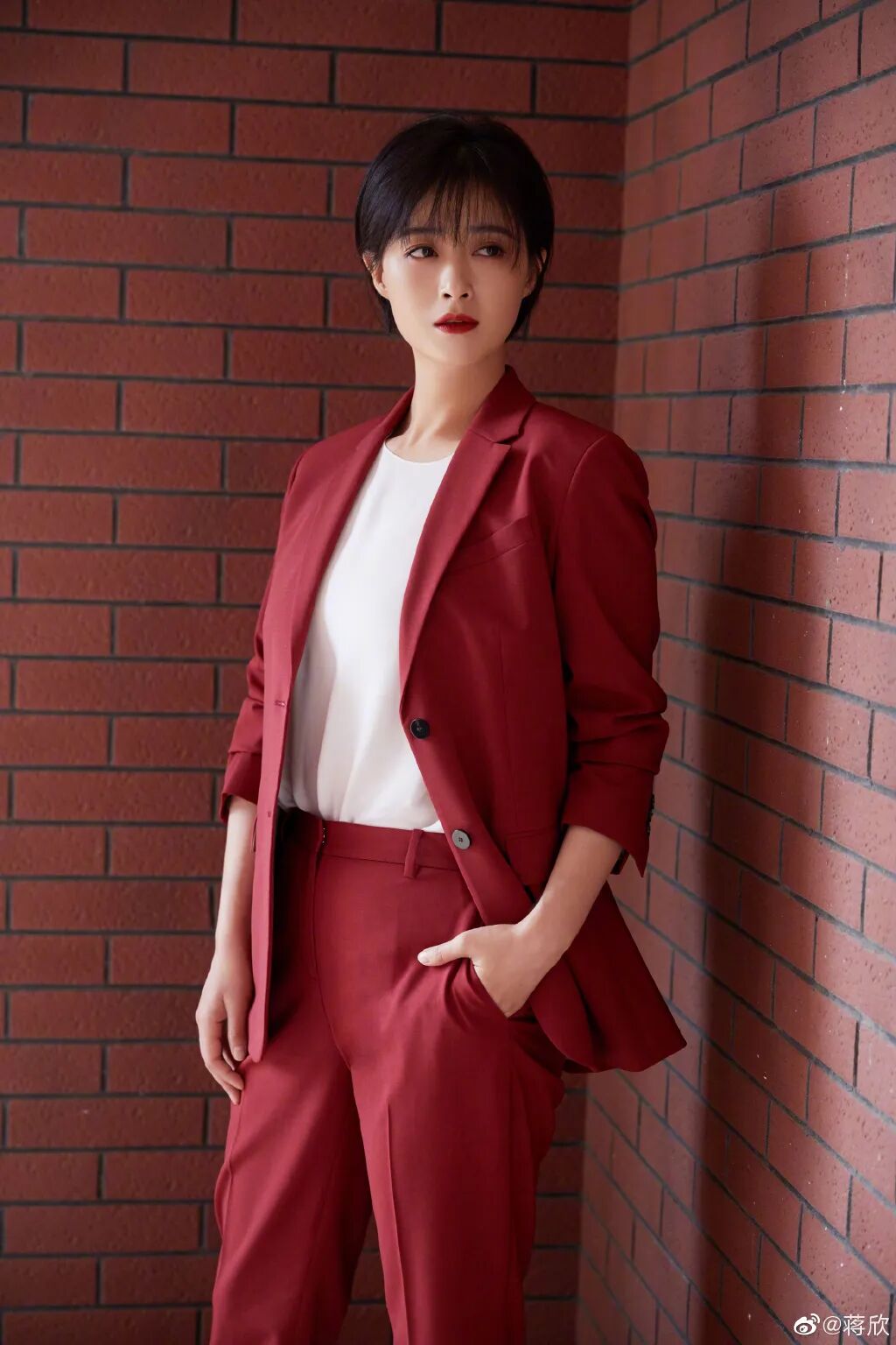 再看看蒋欣其它的西装造型,不难发现,统一的直角肩便是显瘦的关键所在。