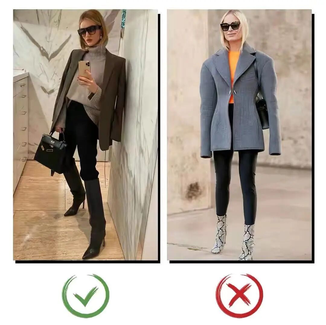 想要让上身看起来显瘦,那么在外套的选择上,一定要注意肩线的选择。直角肩的造型在视觉上会产生缩小肩宽的效果。