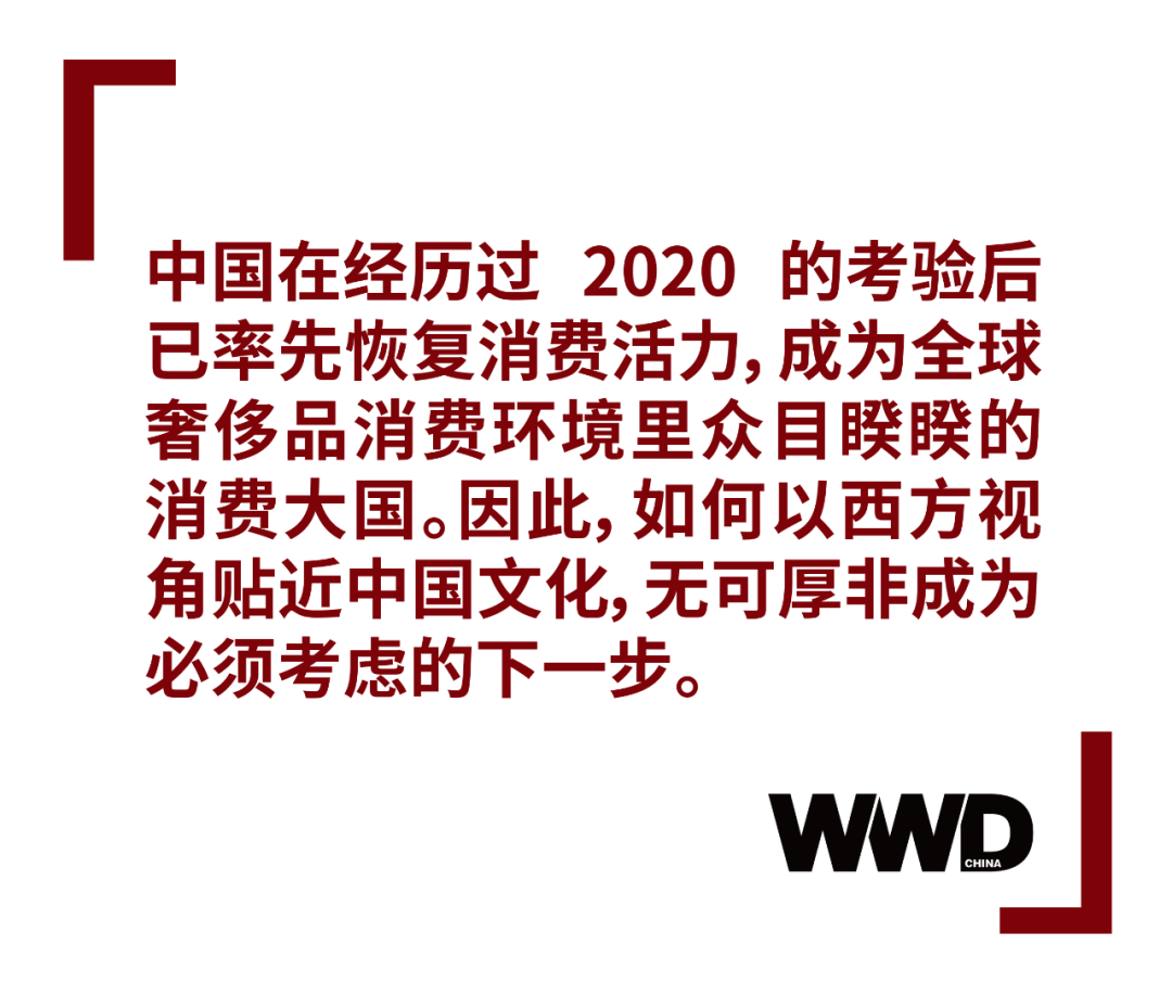 除 Louis Vuitton 和 Chanel 外,Loewe 也在品牌 2021 秋冬女装秀受疫情影响取消后宣布自发制作出版物,不仅刊登图片,Loewe 报刊还摘录了小说家 Danielle Steel 一本刚出版的新书。品牌还在最新报刊中表示,时尚是关于某个短暂的瞬间,而日报则是对“现在”的记录,两者存在着内在联系;前不久,在奢侈品领域总能创造话题的意大利奢侈品牌 Bottega Veneta 相继关闭一系列社交账号后,既反其道而行、又顺势而为地推出了第一期电子杂志《Issue 01》。种种文化建设行为都直指一套套完整的文化价值体系,已成为国际奢侈品牌的另一大关注视角。然而这只是第一步,更重要还有中国在经历过 2020 的考验后已率先恢复消费活力,成为全球奢侈品消费环境里众目睽睽的消费大国。因此,如何以西方视角贴近中国文化,无可厚非成为必须考虑的下一步。