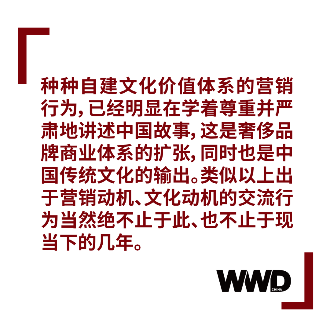 在征集文案中,《Elle Men》提到“自古以来,这是弥漫于我们文化传统中的一种自然”。既以书写的形式传达与中国传统的结合,也传达着万宝龙品牌自建立以来的书写精神。此后几个月,万宝龙中文冯唐体表情包也在微信表情商店上线,还联合推出了 24 节气手机壁纸,无一不在渗透着品牌营销行为中,与中国本土各种文化行为的融合。种种自建文化价值体系的营销行为,已经明显在学着尊重并严肃地讲述中国故事,这是奢侈品牌商业体系的扩张,同时也是中国传统文化的输出。类似以上出于营销动机、文化动机的交流行为当然绝不止于此、也不止于现当下的几年。