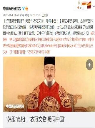 近半年,与汉服相关的最热话题是“中韩两国关于汉服起源之争”。韩国网友攻击原创汉服抄袭韩服,并发布汉服起源韩国的言论,引得各路网友愤起群击。从历史角度出发,汉服起源中国毋庸置疑,韩国曾作为我国藩属国,“衣冠文物悉同中国”才是韩服的历史真相。如此种种评论将汉服的关注度一路推高,同时激起了浓郁的爱国情怀。