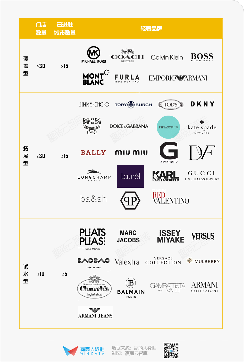 轻奢品牌样本选取:Armani Collezioni、ARMANI JEANS、ba&sh、BALLY、BALMAIN、baobao、Calvin Klein、Church's、COACH、DKNY、DOLCE&GABBANA、DVF、Emporio Armani、FURLA、G GIVENCHY、Giambattista Valli、GUCCI TIMEPIECES&JEWELRY、HUGO BOSS、Issey Miyake、Jimmy Choo、KARL LAGERFELD、Kate Spade New York、Laurel、Longchamp、MARC JACOBS、MCM、Michael Kors、miu miu、MONTBLANC、Mulberry、PHILIPP PLEIN、Pleats Please、RED Valentino、Tiffany & Co.、TOD‘S、Tory Burch、Valextra、Versace Collection、VERSUS共39个品牌