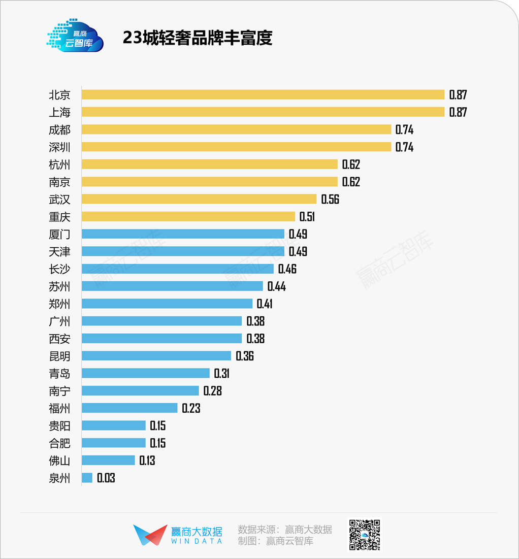 整体而言,相较于重奢品牌的布局,23城轻奢品牌集中度相对较低,除北京、上海、成都、深圳、杭州、南京、武汉、重庆8城的轻奢品牌丰富度超0.5外(品牌丰富度=进驻品牌数量/39个样本品牌),其余15城引进的品牌数仍较有限,对于试水型和拓展型品牌而言,有较大进入空间。