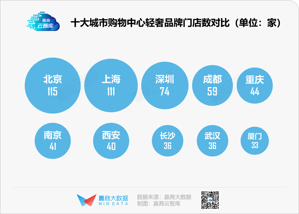 北京、上海,是轻奢品牌进入中国市场的首选之处,两地购物中心轻奢品牌门店均超110家。同为一线城市的深圳、广州,因毗邻港澳,早期本土奢侈消费习惯未养成,轻奢品牌拓展相对谨慎,其中广州购物中心轻奢品牌数量甚至未进入全国前十。