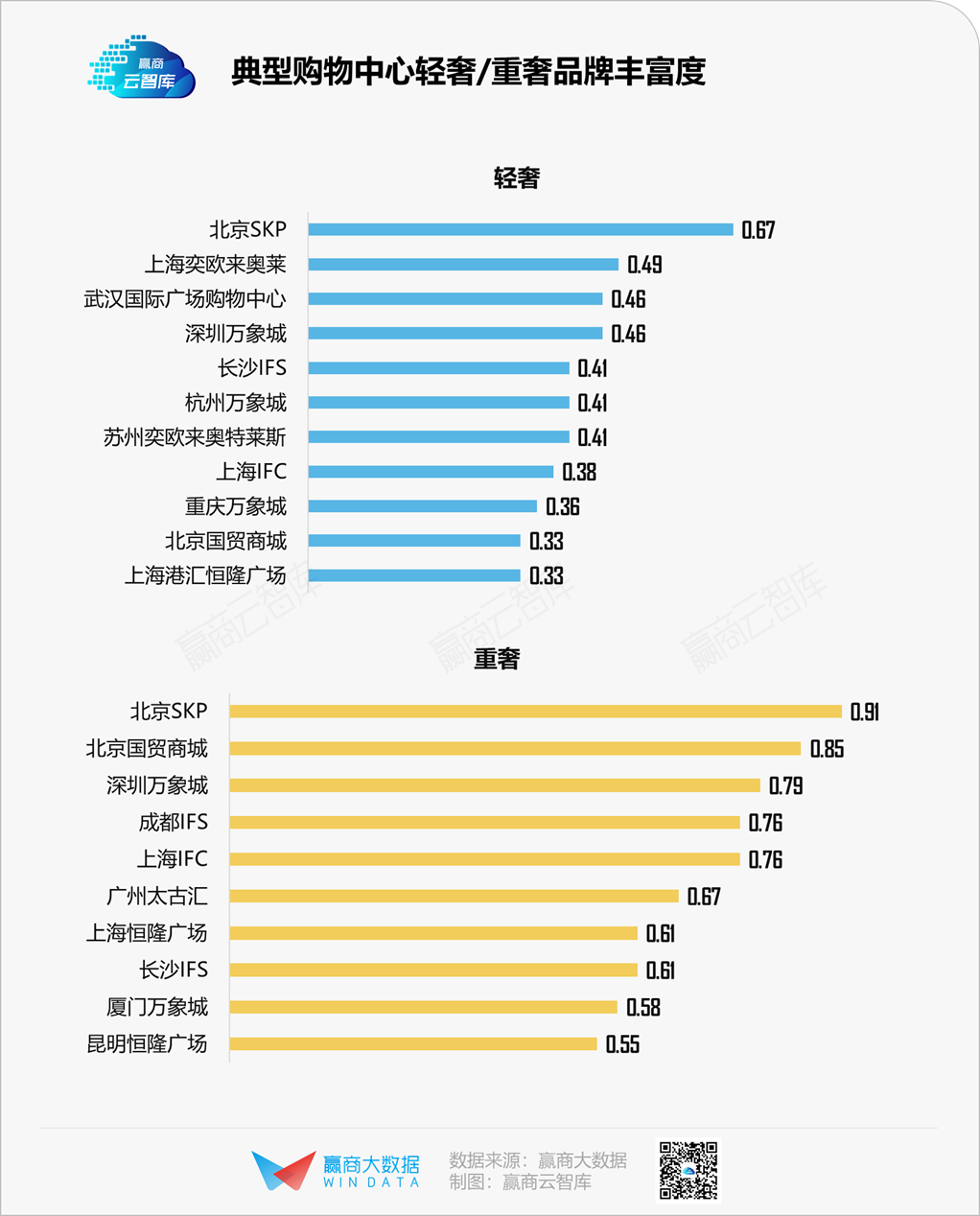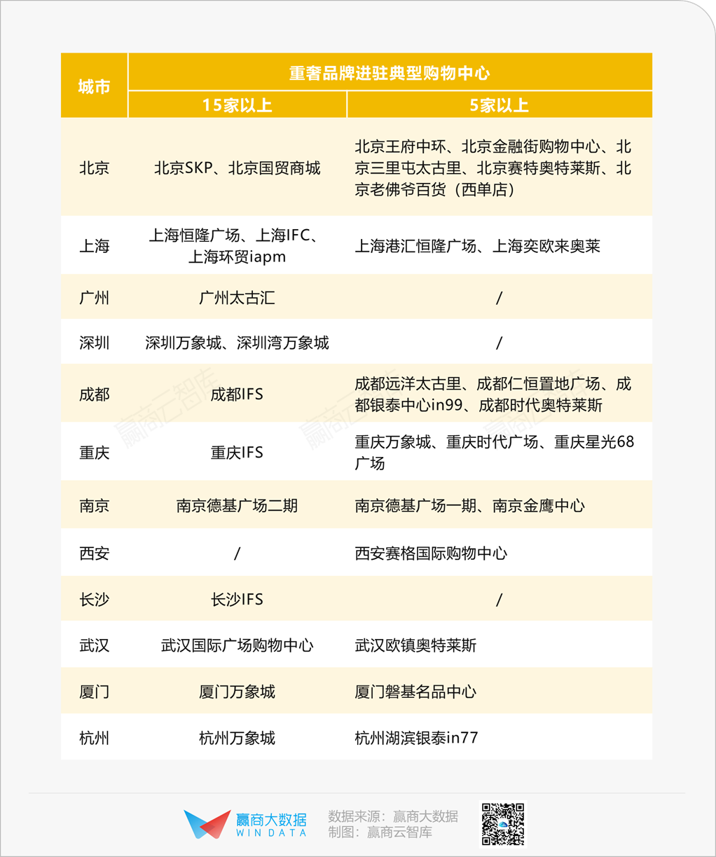 另从购物中心奢侈品牌丰富度来,重奢趋向“抱团”进驻,高度集中,如进北京必选SKP、国贸商城,进深圳必选万象城,进成都必选IFS......