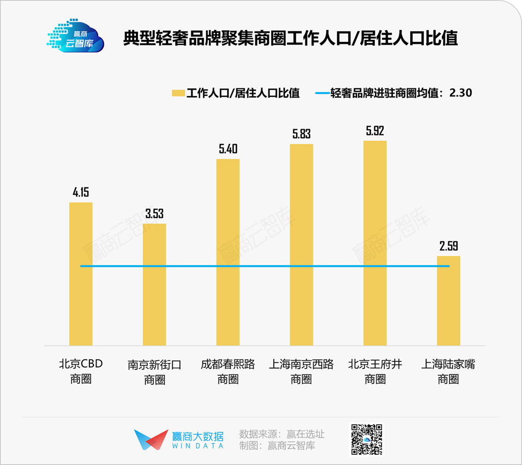 从商圈客群特性来看,轻奢品牌选址偏向工作人口聚集型商圈,平均工作人口/居住人口比值为2.3,成都春熙路商圈、上海南京西路商圈、北京王府井商圈这一比值甚至超过了5。云集的高级写字楼中,容纳着对体面包包、服饰有着大量需求的时尚白领。