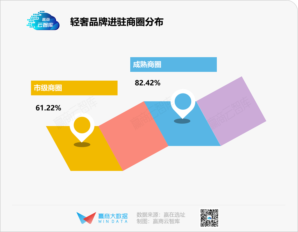从商圈选址来看,轻奢品牌首选市级商圈(占比61.22%)、成熟商圈(占比82.42%),但偏好度率低于重奢品牌(市级商圈80.35%、成熟商圈91.36%)。这些区域有广泛的客群覆盖度、成熟的商业氛围,与其目标客群高度匹配。