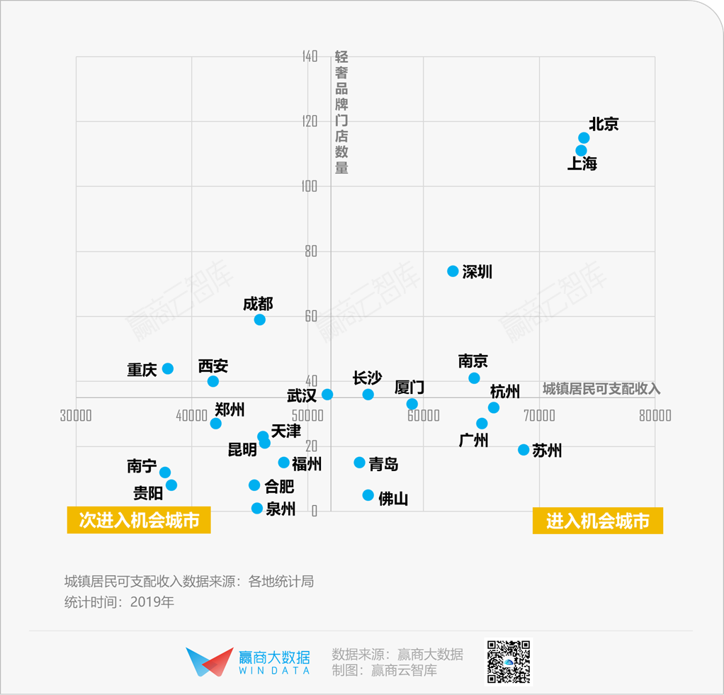 而对于“次进入机会型”城市,虽城镇居民可支配收入不及上述城市,但仍高于全国均值,且轻奢品牌门店数量较少,市场可拓展空间同样诱人。