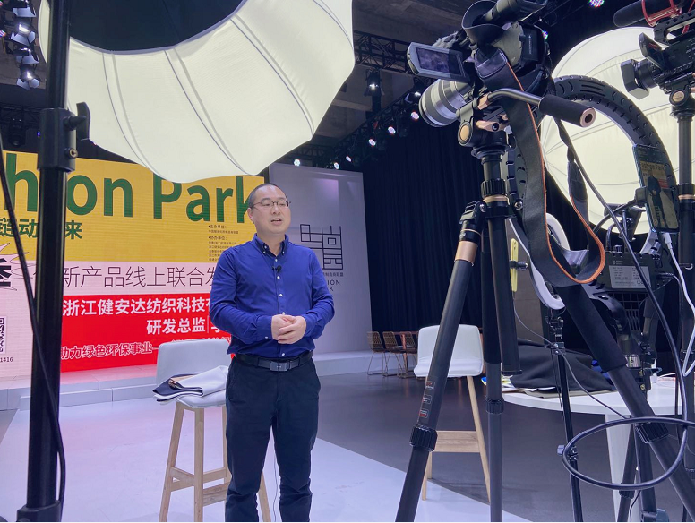 此次创新产品线上联合发布会上,浙江健安达纺织科技有限公司研发总监李圣虎首先上场为直播间的观众展示了4款创新面料,包含生物环保、弹性优越、吸湿保暖、手感柔软的 Sorona面料;最大限度发挥棉织物固有的性能,舒适感极强,液氨可回收的绿色环保液氨面料;优质100%的新疆长绒棉,手感滑爽,冰感亲肤的长绒棉双面布以及Q弹、蓬松、回弹性佳,不易起折的三明治。