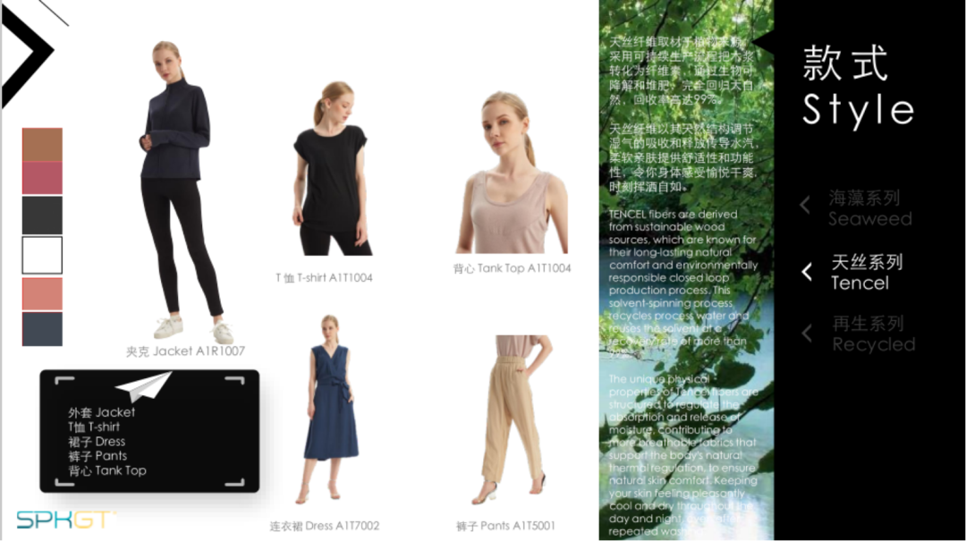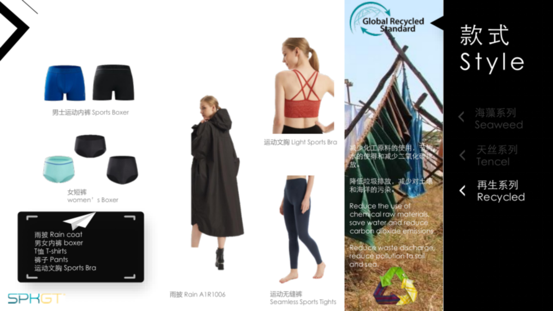 主要包含了使用天丝等可持续生产流程粘胶/再生涤纶/氨纶制成的人棉/涤纶/氨纶衬衫;使用塑料瓶回收的再生涤纶制成的涤纶文胸;使用渔网等废弃物提取的再生尼龙制成的尼龙内衣、泳装;使用再生涤纶/再生尼龙/天丝/氨纶制成的夹克以及使用天丝等可持续生产流程粘胶取代的人棉T恤。
